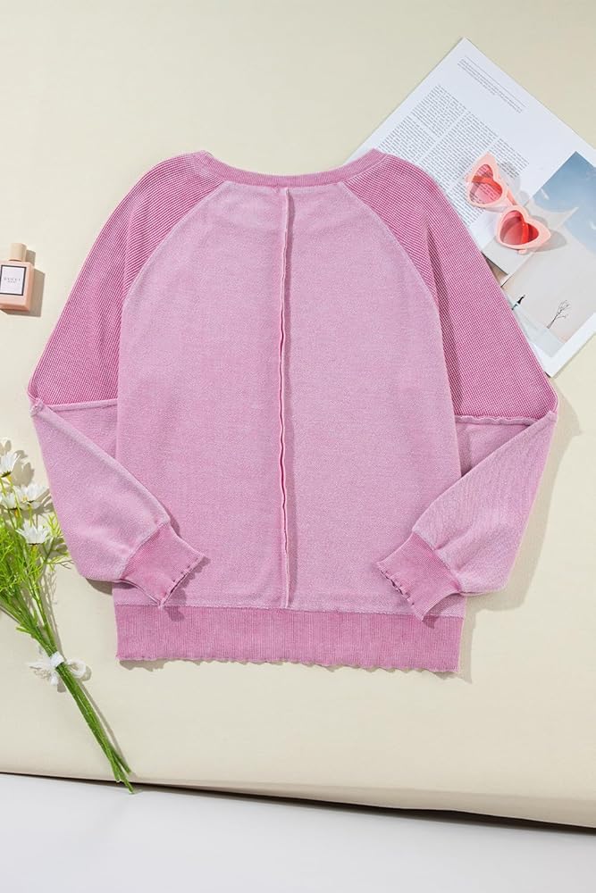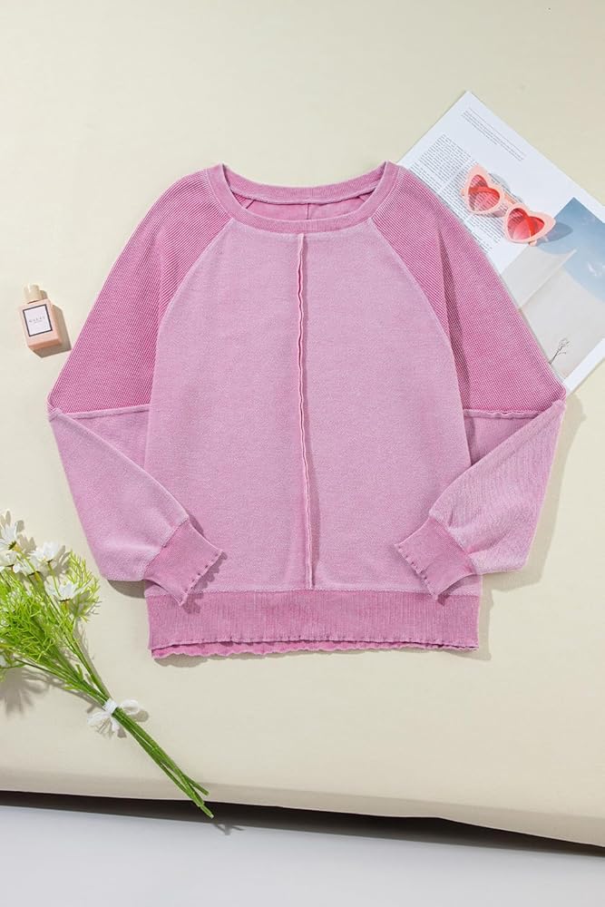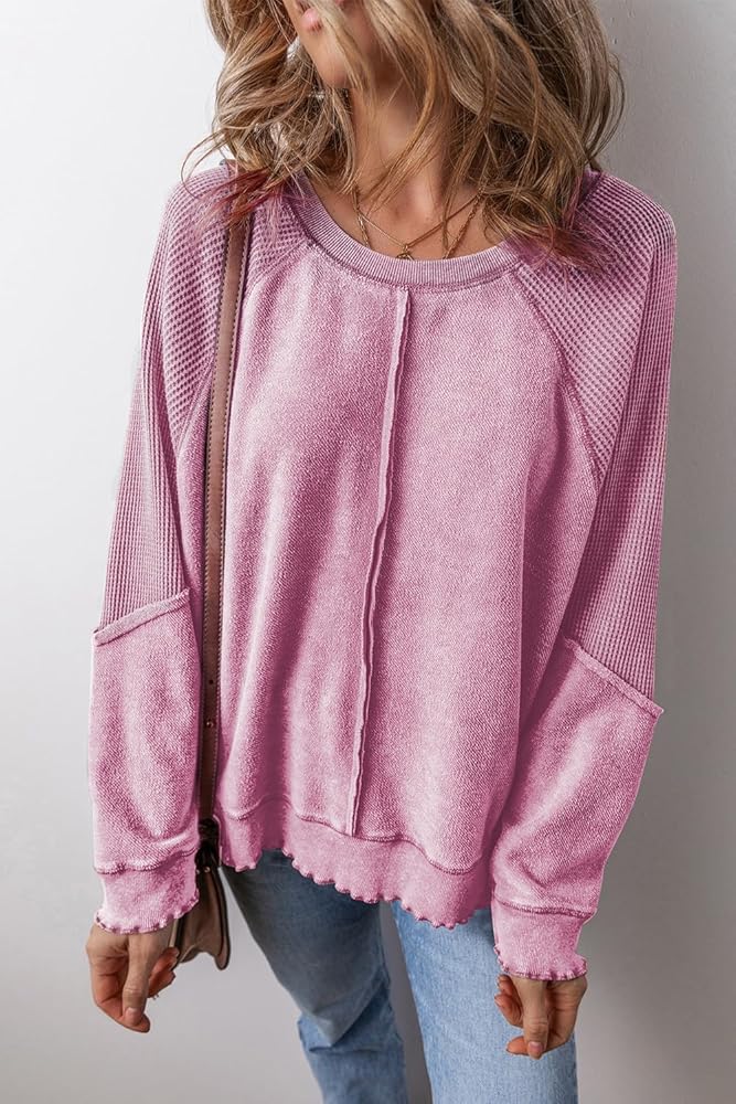❥المميزات: بلوفر لطيف مع تصميم درزات مكشوفة منسوجة بنسيج وافل. تصميم فضفاض، رقبة دائرية، وأكمام طويلة، وأساور بكرانيش. قمصان ثقيلة مرقعة بألوان ثابتة، بلوفر عصري بأكمام طويلة للنساء.