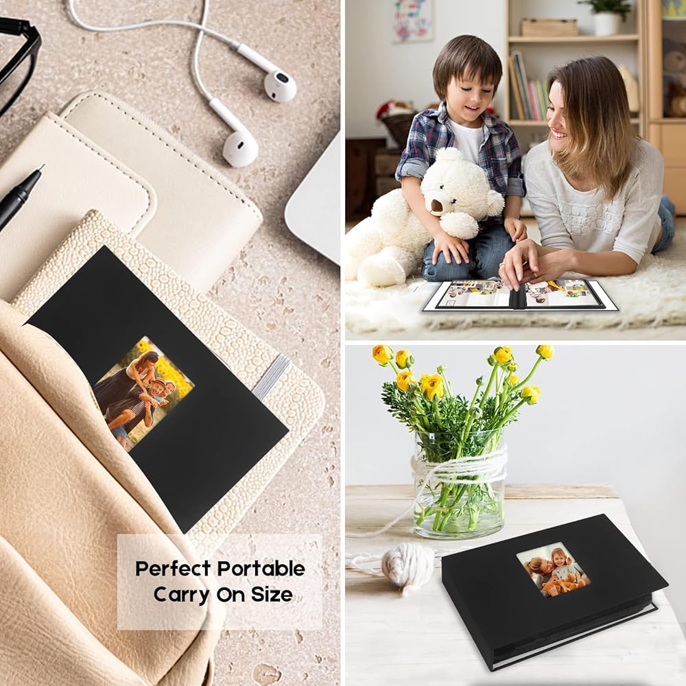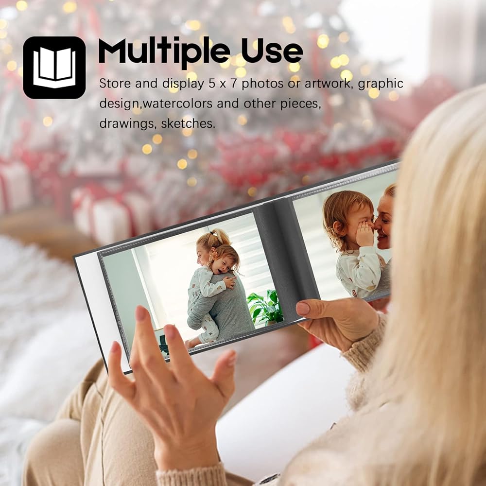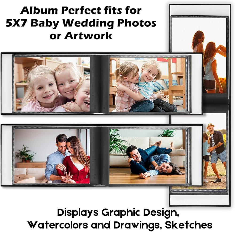 مرن وخفيف الوزن - كتاب ألبوم الصور هذا مقاس 5x7 خفيف الوزن لحمله في الحقيبة للاحتفاظ به وسهل وضعه بداخله. كل جيب عرض عبارة عن صفحة داخلية سوداء، مثالي لعرض الصور مقاس 5x7 والبطاقات البريدية والأعمال الفنية وغير ذلك الكثير.