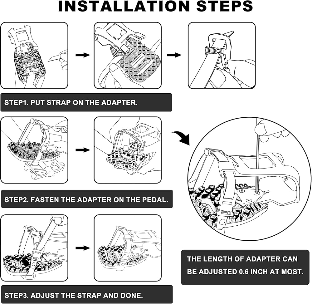 تركيب سهل - يتضمن مفتاح ربط سداسي لضبط قفص أصابع القدم بسهولة على الحجم المناسب. مطلوب 3 خطوات. قم أولاً بوضع الأشرطة على المحول ثم قم بتثبيت المحول على الدواسة وفي الخطوة الأخيرة اضبط الحزام ليناسب قدمك.