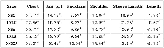 - المقاس: SMC: الصدر: 24.41 بوصة، فتحة الذراع: 14.17 بوصة، الطول: 41.73 بوصة؛ LXLC: الصدر: 27.56 بوصة، فتحة الذراع: 15.75 بوصة، الطول: 45.67 بوصة