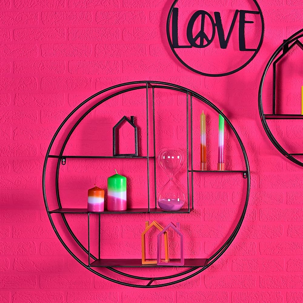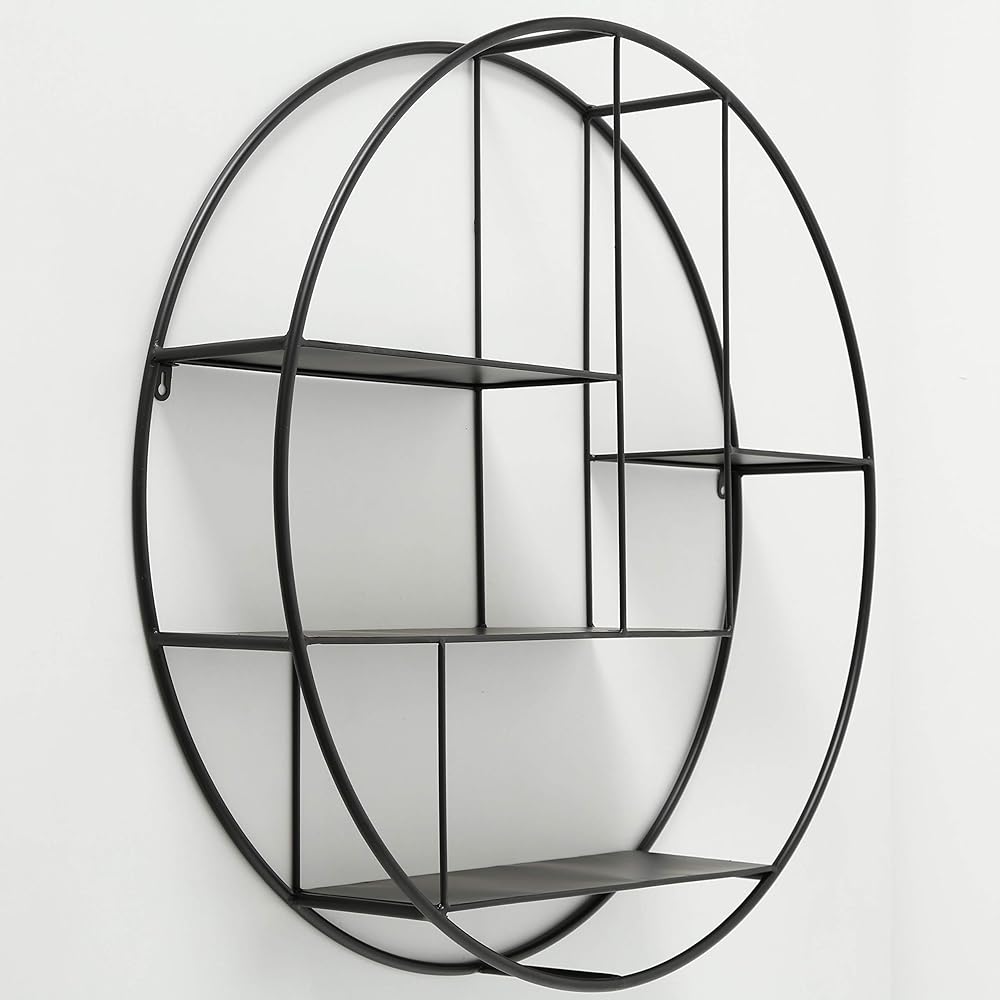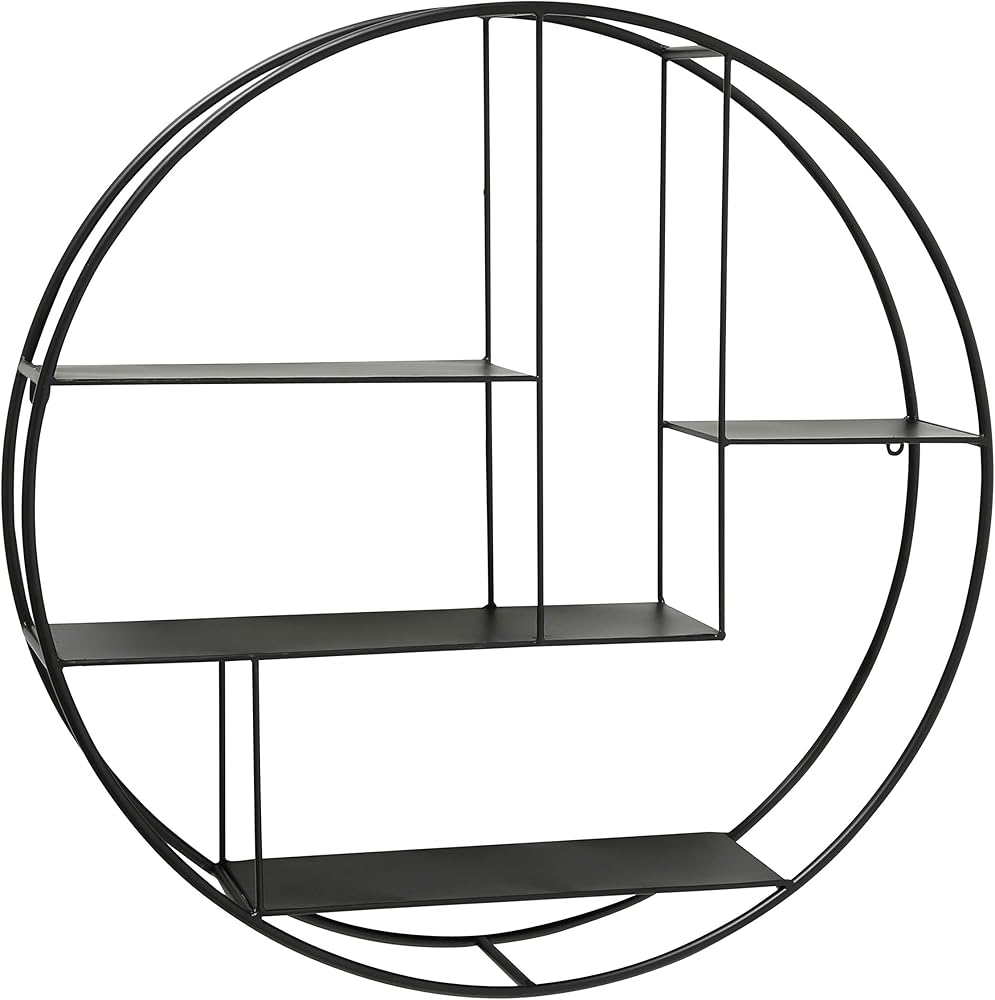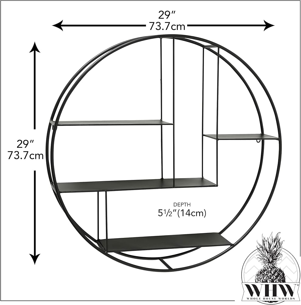 Make a circular statement on your wall with the Industrial Round Wall Shelf. Designed to showcase collections and personal items within its eye-catching frame. Deep shelves within the ring bring 4 levels of display possibilities. Crafted of sturdy powder coated iron, this piece allows for storage inside each of the 4 shelves in the unit. Well sized, this piece measures as follows: 29 inch diameter with a 5 1/2 deep profile from the wall. Easy to mount, this round piece has built in keyhole hangers. Decorative and functional, this circular unit is well suited to fit with a variety of design themes including urban, industrial, rustic and modern. Welcome to the product line of Whole House Worlds. The New York based company offers high quality, stylish products for every room in the house, and beyond. From the kitchen, to the living room, to the bedroom, dining room, home office, closet and garden: Our criteria are comfort, quality, style and value.