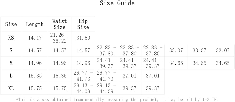 XS:Hip Size:31.5IN,Length:14.2IN,Waist Size:21.3-36.2IN