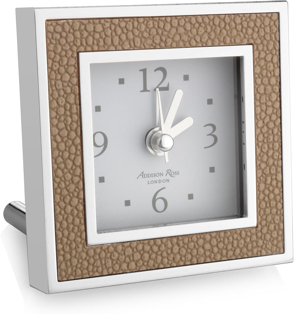 Experience the elegance of the Addison Ross Shagreen Sand Alarm Clock. A perfect complement to our enamel frames, this clock features an alarm function and a silver clock movement cover. Backed in black velvet, it is ideal for a bedside table or desk, providing both functionality and style. Powered by 1 AA battery, it arrives beautifully packed in the branded box and tissue paper.