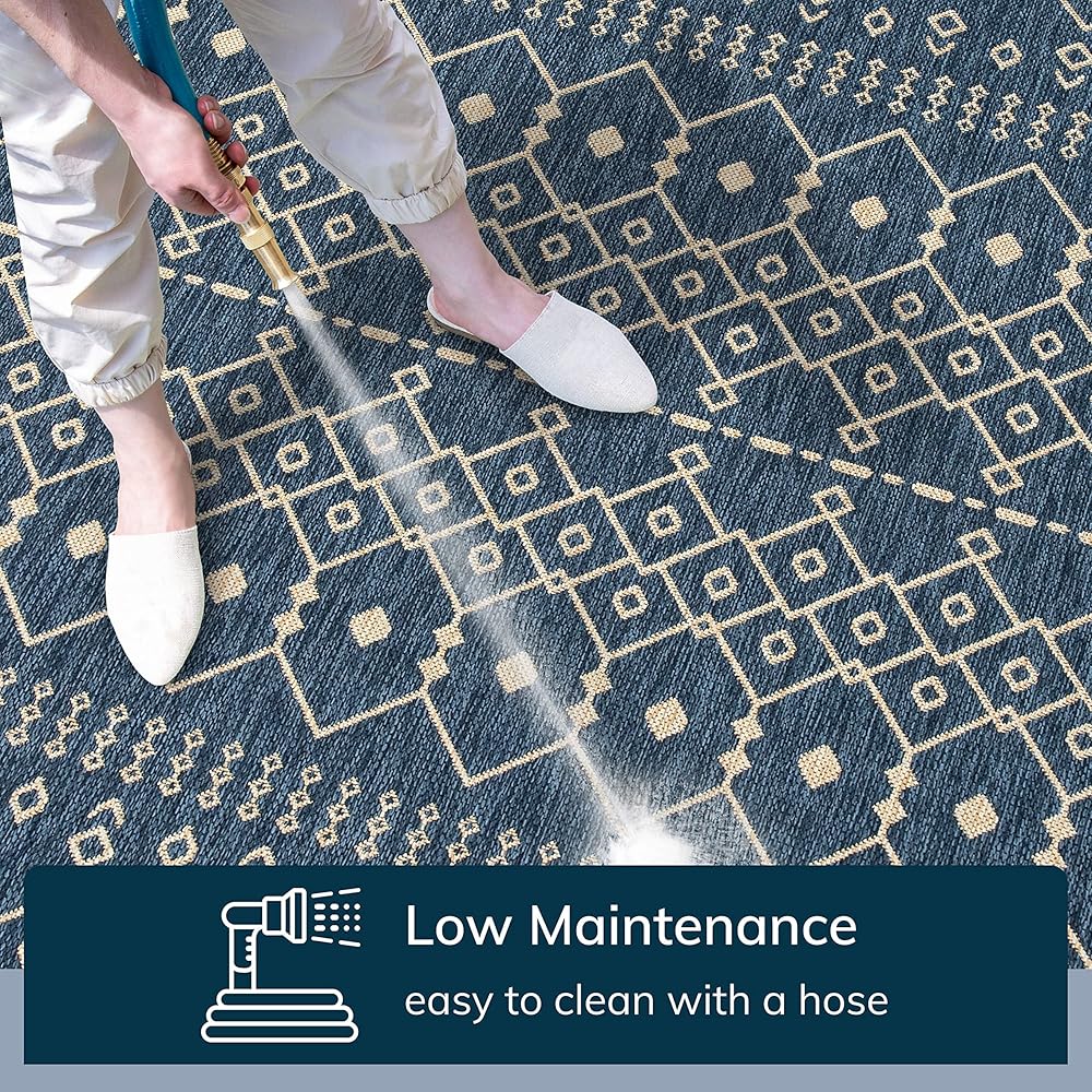 A combination of vibrant and lively, neutral and natural colors with contemporary transitional patterns in the Medusa Collection brings the quality and creative flexibility of indoor designs to outdoor spaces. The 100% polypropylene flat-weave pile is UV protected. The yarn is stain and fade resistant and is as easy to clean as hosing it off, making this collection perfect for high-traffic spaces both indoors and out.