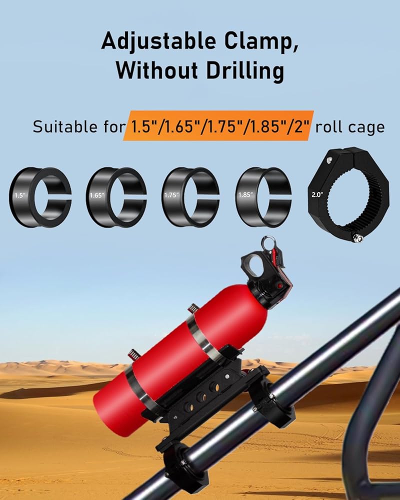 • Solid Material: This UTV fire extinguisher mount is made of high-hardness aluminum and 304 stainless steel, instead of tear-apart-easily cloth, it's long-term use without rust.