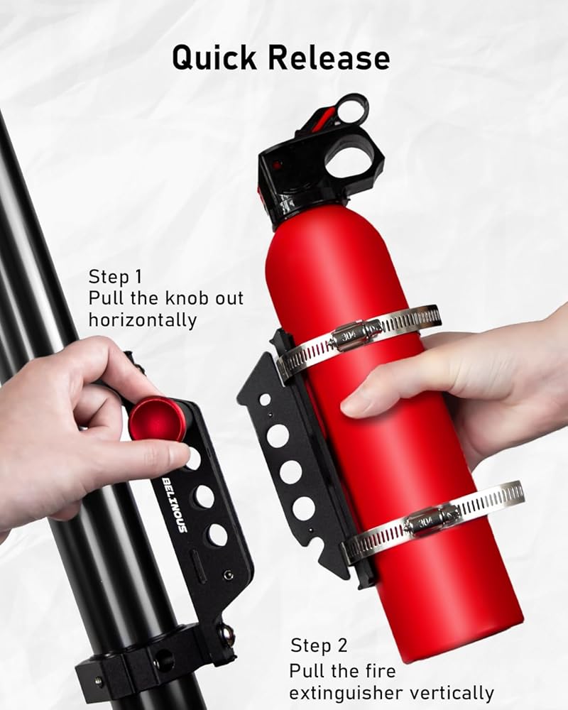 Use the adjustable rings (65-89mm, 78-101mm) to fix your fire extinguisher, and they are super easy to take off when you need, one hand to pull the red knob out horizontally, and the other hand to pull the fire extinguisher vertically.