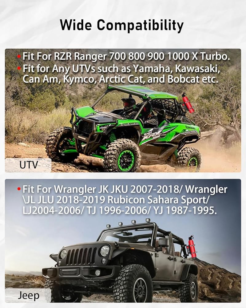 The Jeep fire extinguisher with mount fits 1.5"/1.65"/1.75"/1.85"/2" roll bar, compatible with most vehicles, like RZR Ranger 700 800 900 1000 XP Turbo, UTV Polaris, Kawasaki, Can-Am Maverick, Kymco Arctic Cat and Bobcat, also can use at garden, home, office, public area, etc.