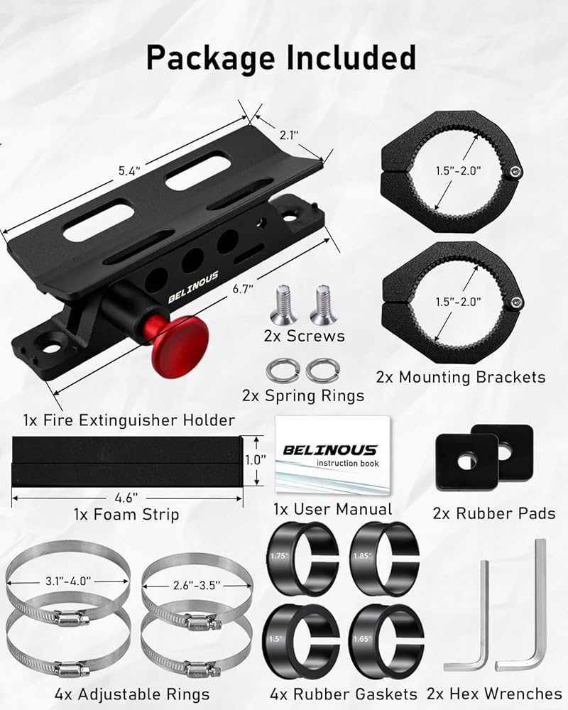 • Package Included: 1x fire extinguisher holder, 4x adjustable rings, 2x mounting brackets, 4x rubber gaskets, 2x rubber pads, 2x screws, 2x hex wrenches, 2x spring rings, 1x foam strip, 18-month trouble-free warranty, and 24-hour online customer service.