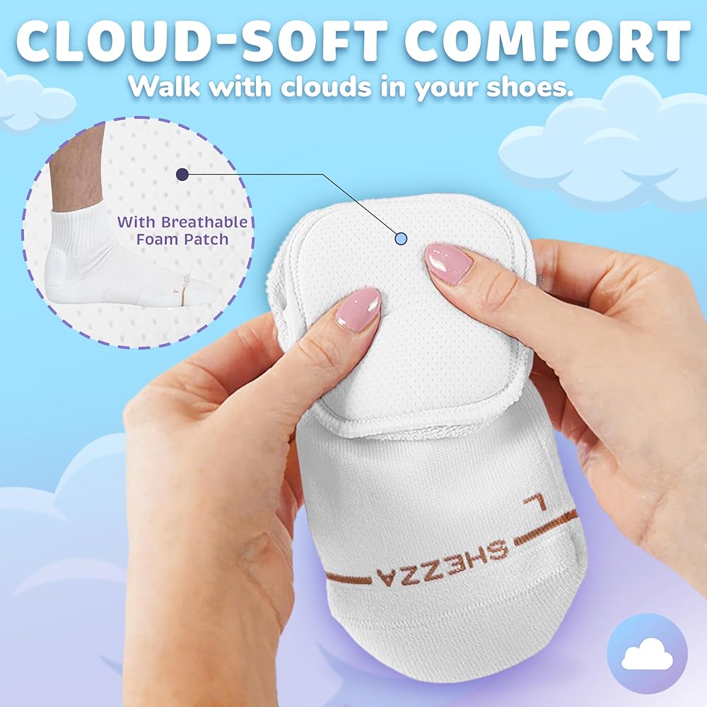 تقنية مبطنة بالفوم - تحمي كعبك برقعة إسفنجية فريدة ومريحة وجيدة التهوية مدمجة في كل زوج. تم وضع تقنيتنا المبتكرة بشكل استراتيجي في منطقة الكعب لتوفير توسيد ودعم فائقين. سواء كنت تمشي أو تجري أو تقف لفترات طويلة، فإن جواربنا المبطنة بالإسفنج توفر راحة استثنائية.