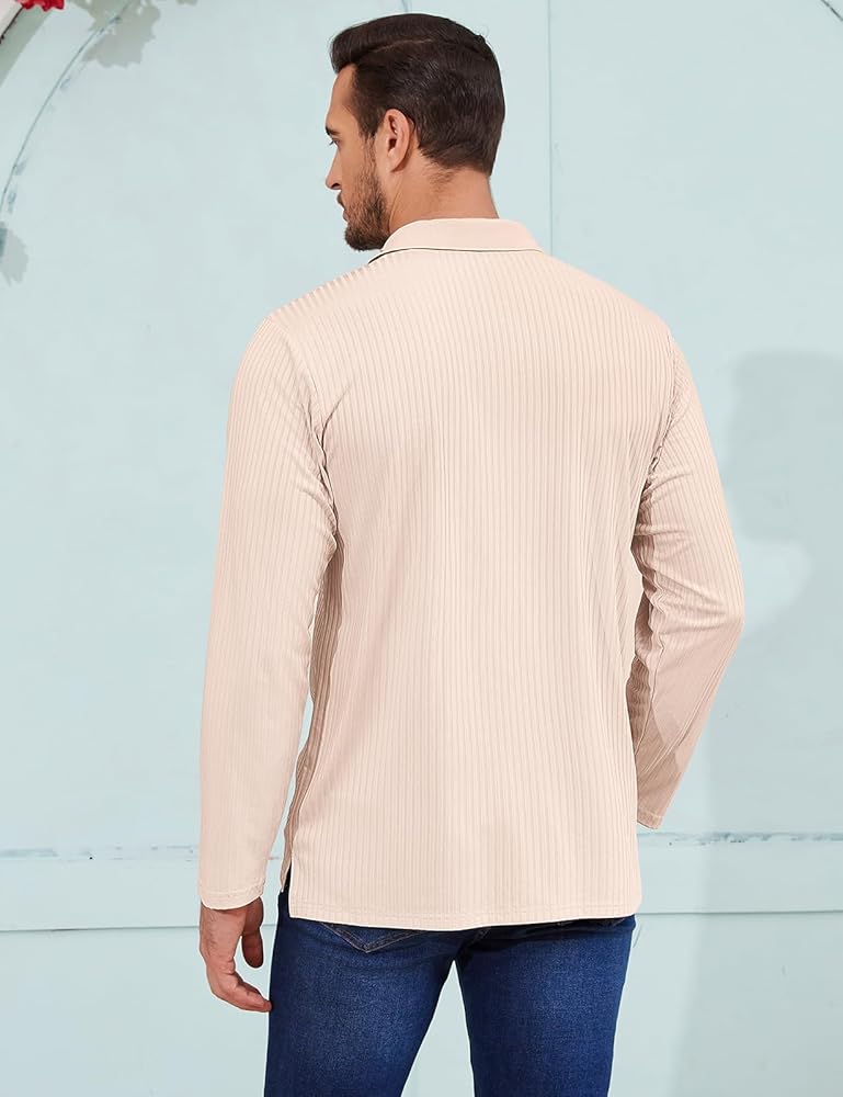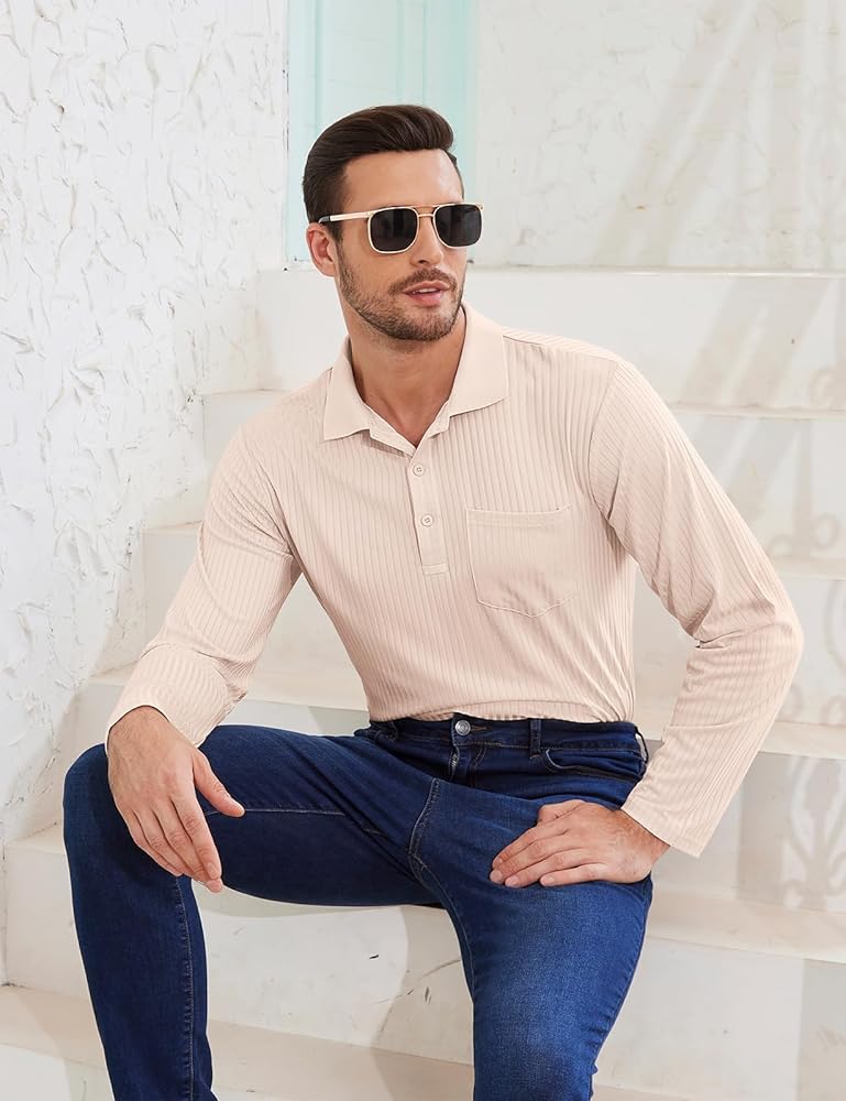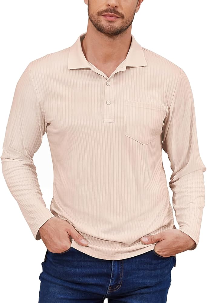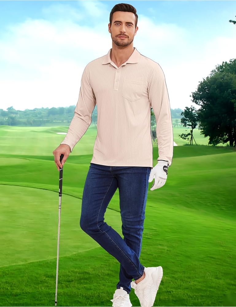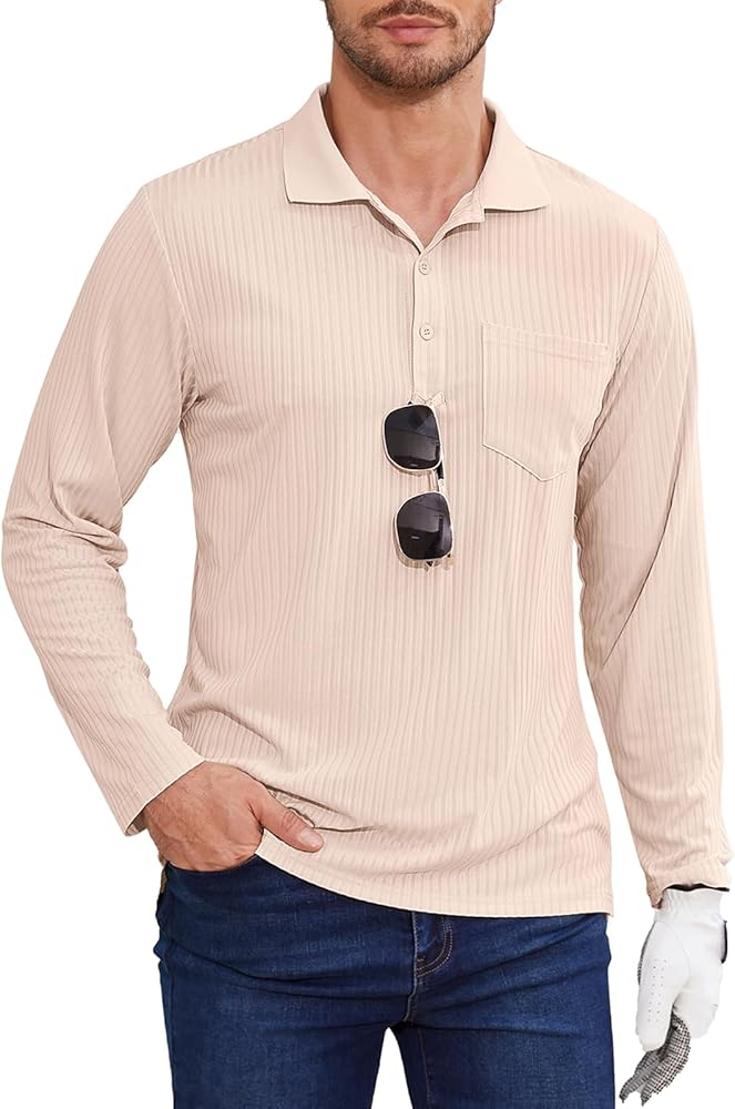 Tanst Sky Mens Polo Shirts Long Sleeve Lapel Collar V Neck Pocket Knit Tops Moisture Wicking Quick Dry UV Protection Golf Clothes