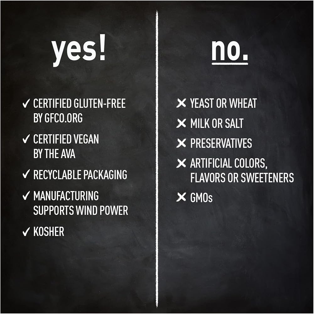 Responsibly made - Certified Gluten-Free. Made with recyclable packaging and the manufacturing of this product supports wind power. This product does not contain wheat, yeast, milk, salt, preservatives, artificial colors, flavors or sweeteners and No GMOs.
