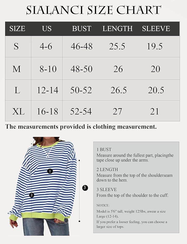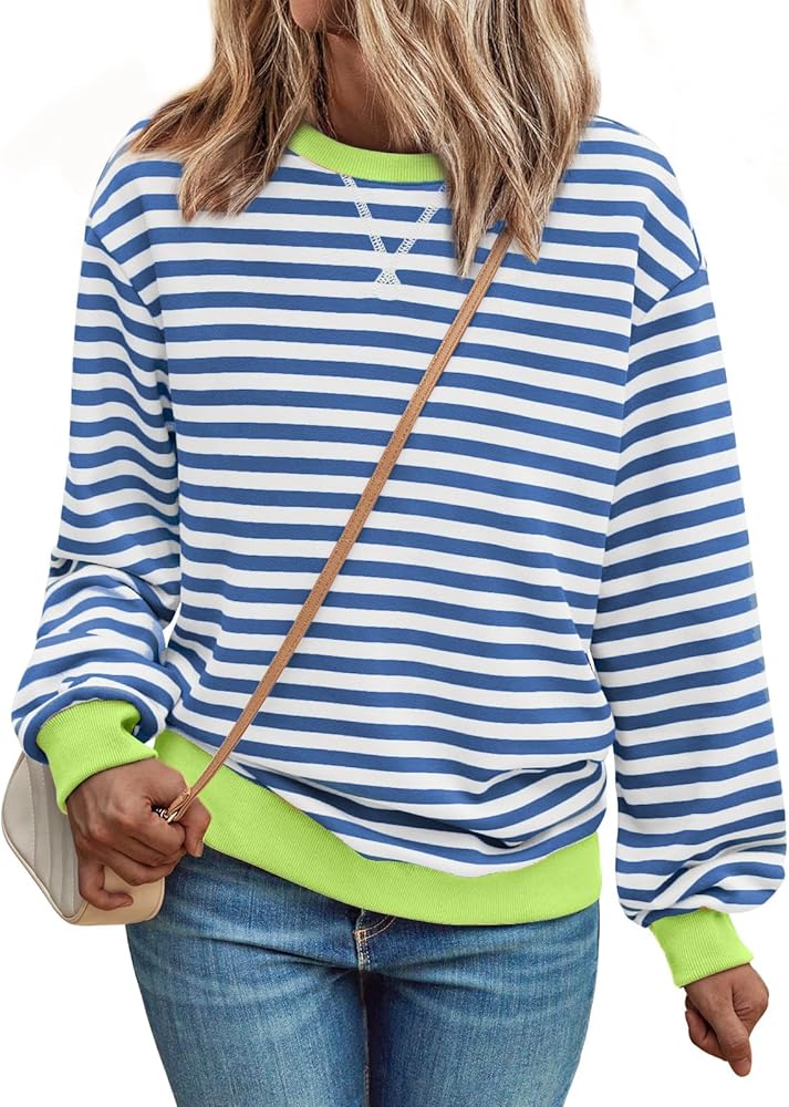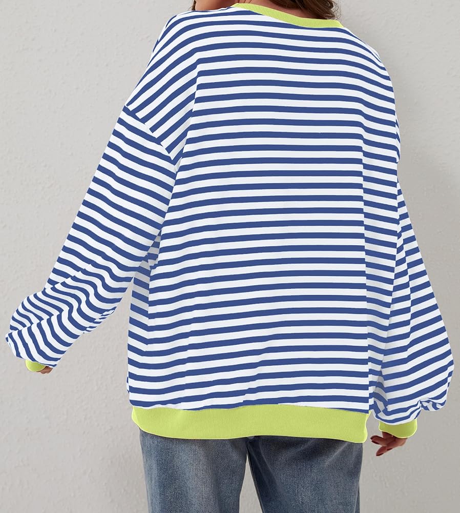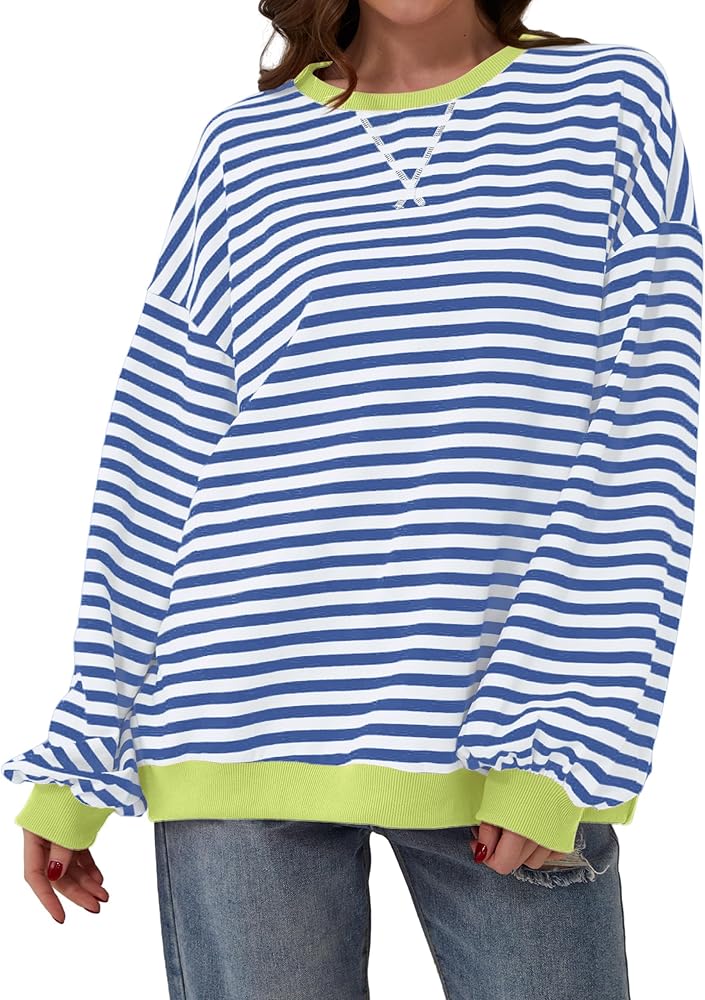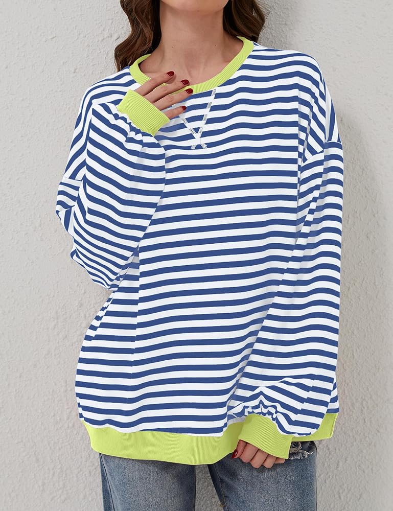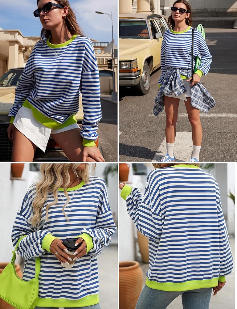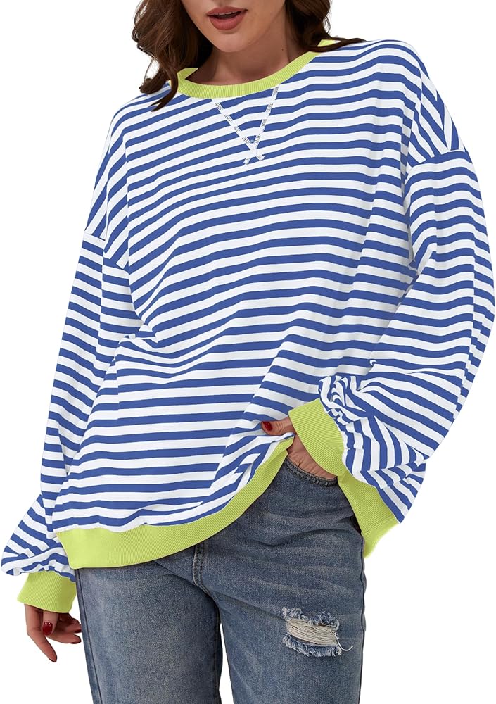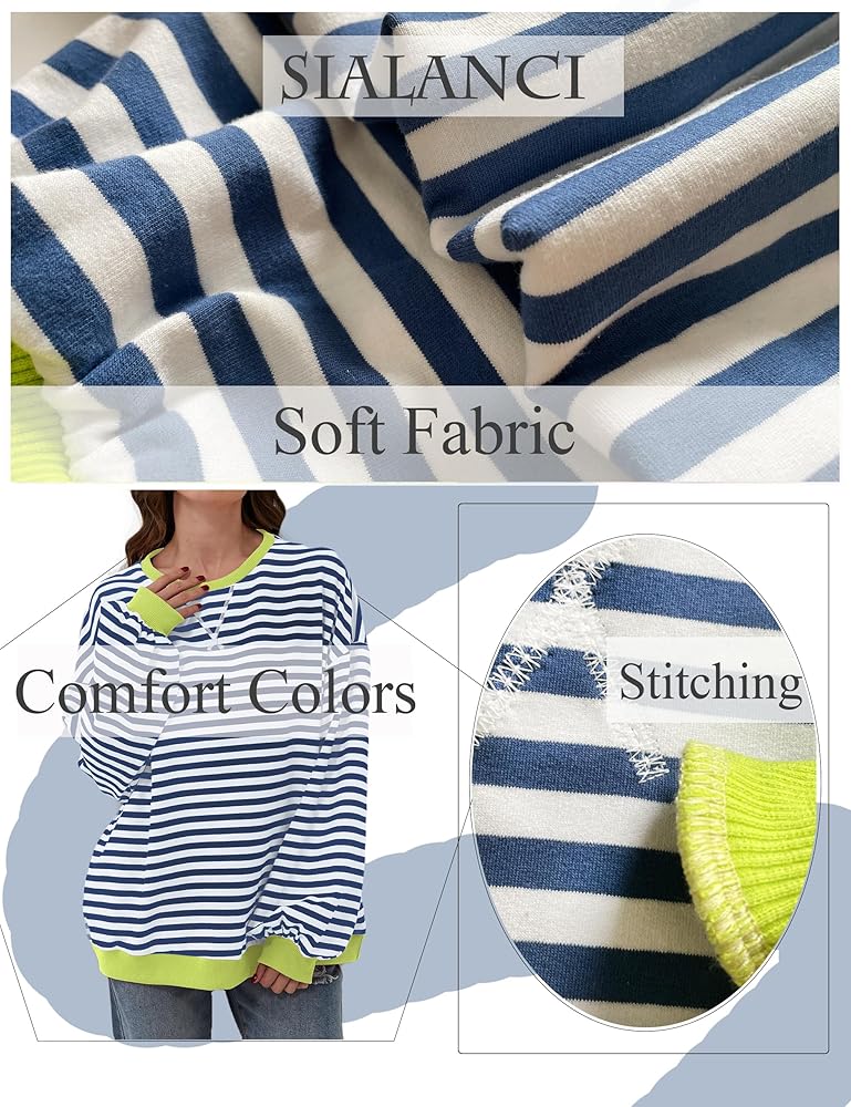 المزايا: سويت شيرت نسائي مخطط كبير الحجم يتميز بألوان مريحة، رقبة دائرية، أكمام طويلة، فائق النعومة، غير عاكس. بلوفر ليلي لخريف وصيف 2024 من أفضل الملابس العصرية