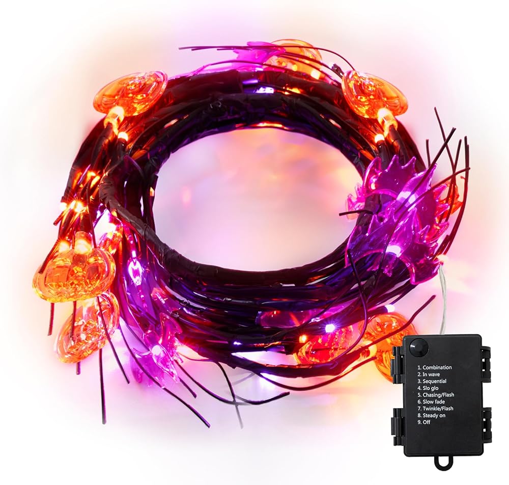 We have two styles of Halloween rattan lights: the purple bat style and the purple and orange bat+pumpkin style. There is always one that you will like, which can be placed on the table as a decoration for the Halloween dining table, or rolled up and hung on the wall in a suitable position.