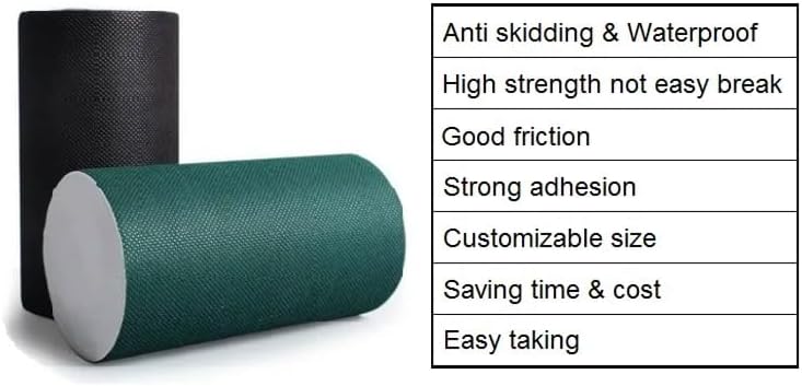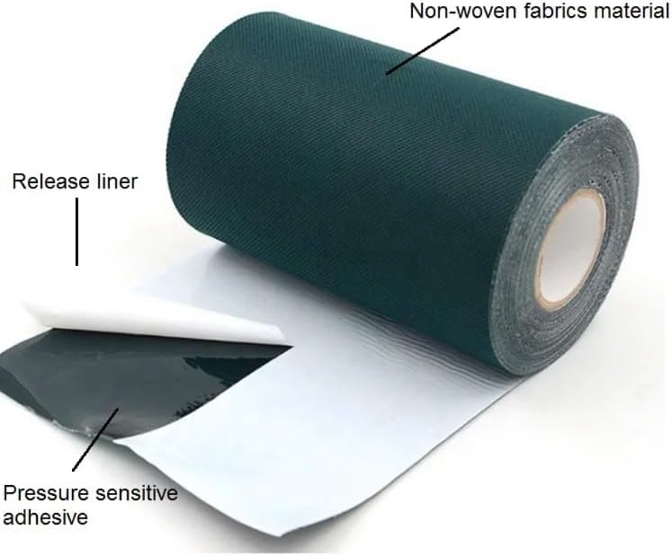 Artificial Grass Tape for Lawn, 6'' X 16', Green Durable Material: The artificial grass seam tape is made from strong and durable non-woven fabric, coated with extremely strong butyl adhesive, with superb adhesive power and waterproof. good for all coarse surface types. That Delivers a Durable Lifespan: This turf seam tape has excellent UV resistant and waterproof performance, even in rainy area and wet eviroment, the tape adheres well. Easy to Use: This artificial grass seaming tape a cut in the mid-line of the adhesive cover making it easy to position and apply the adhesive. just remove the white PE film and stick to the back of synthetic grass. More Scenarios: Turf seam tape is residential, industrial, commercial usage applicable, both indoor or outdoor multi-use. it is will easily withstand various natural environments. NOTICE: Make sure no dust and no fingerprints on adhesive while applying. no water on the adhesive for the first 8 hours in order to create better curing and bonding.