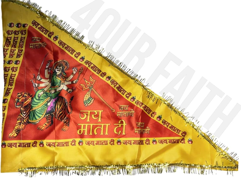 Jai Mata Di Cloth Flag Jhanda Flag Dwaj for Pooja | Printed Sherawali Mata Rani Digital Print Dwaj/Jhanda/Flag Triangle for Home Temple & Outdoor Normal Size Flag | ALL Mata Rani Jhanda | | Use In Rooftop of Office/Home, Car/Bike Rally – Pack of 1 (MULTI COLOR)