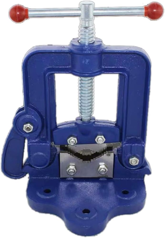 [Size]: Capacity: 10-60mm, suitable for 1/8"-1 1/2" pipe. Pliers body width: 6.29inches(160mm); pliers height: 7.87inches(200mm). [Quality Materials]: The yoke vise is made of forged steel and is coated with fire engine red paint, which is stronger, tougher, corrosion-resistant, durable and can provide long-term service life. [Precise Design]: The pipe vise is designed with 3 mounting holes on it that can be easily installed on a workbench or stand. The locking hinge design makes it easy to insert and remove pipes. [Wide Range of Applications]: Pipe vises are used in plumbing to hold pipes or tubing secure while they're cut or threaded. The pipe vise can handle any size pipe from 1/8" up to 1-1/2". The wide threads on the lock-down screw provide the powerful grip to hold the pipe in place whether you're cutting or threading. [Easy to use]: The pipe vise is made of self-locking hinge construction, whic makes it easy to insert and remove long pipes without the need to pass through.