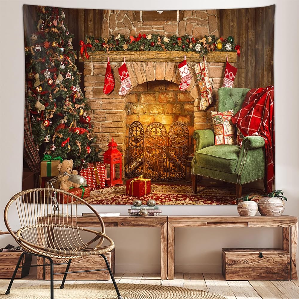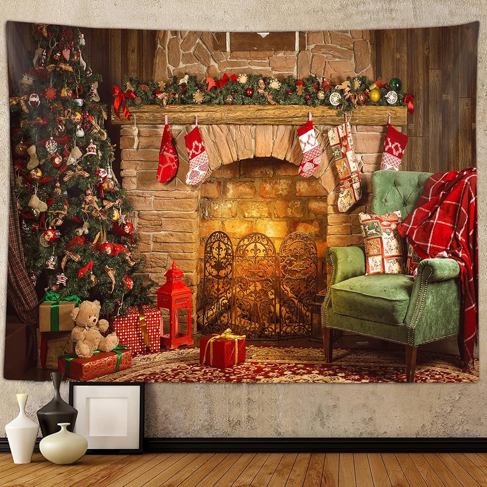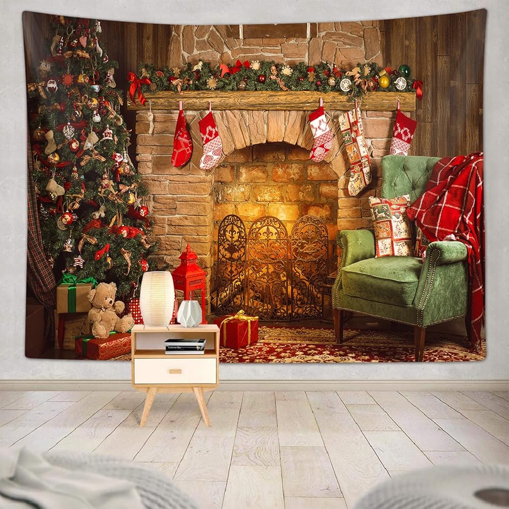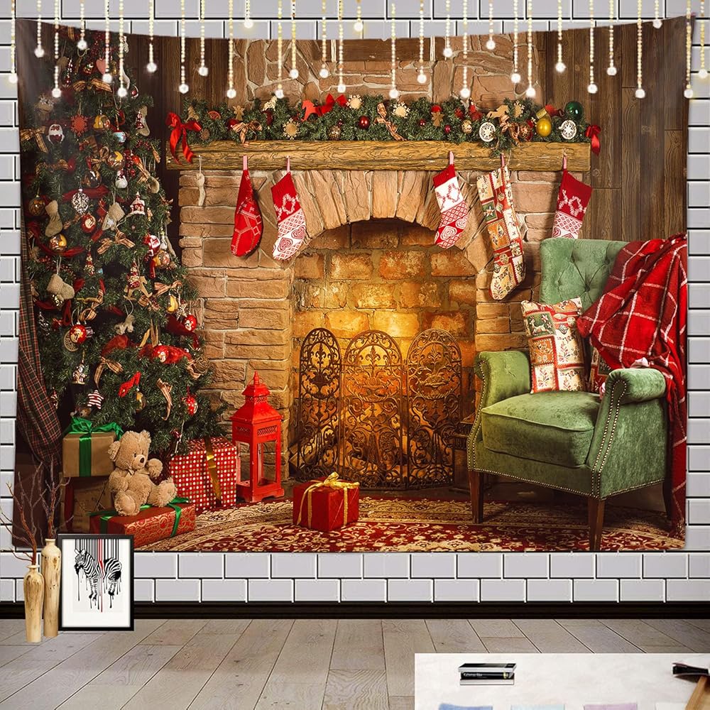 خلفية نسيج عيد الميلاد، مدفأة عيد الميلاد شجرة عيد الميلاد مكان الحريق سانتا كلوز الفن المفروشات الجدار شنقا لحفلة المعيشة في الهواء الطلق عطلة الشتاء ديكور خلفية 60x40 "ملصق