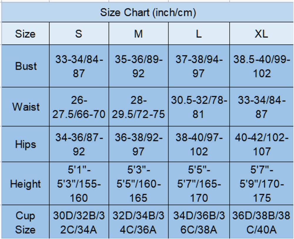 Size XL:Bust 38.5-40/99-102 Waist 33-34/84-87 Hips 40-42/102-107 Height 5'7"-5'9"/170-175 Cup Size 36D/38B/38C/40A