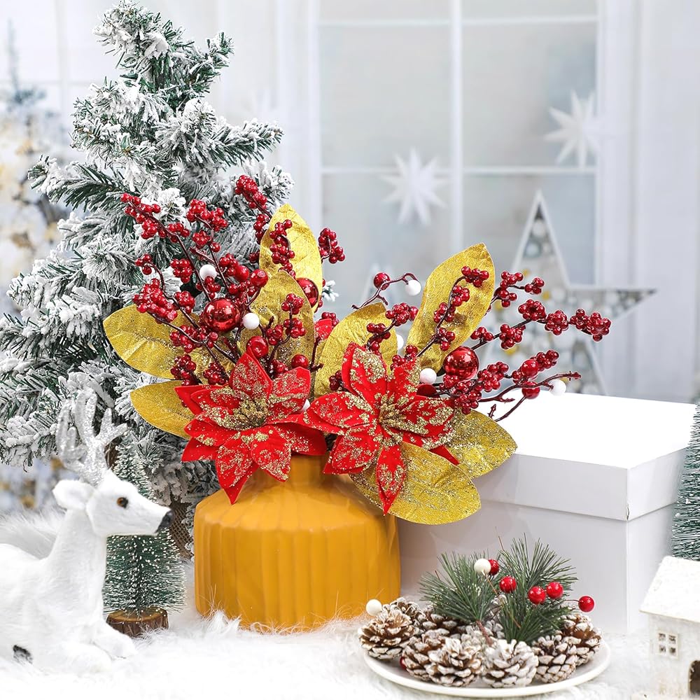 Charming Xmas Decor: the package comes with 4 large glitter Christmas artificial magnolia flowers in total, each branch is paired with a beautiful Christmas ball adorning the branches with red berries and golden leaves; Enough quantity to meet your Christmas decoration needs