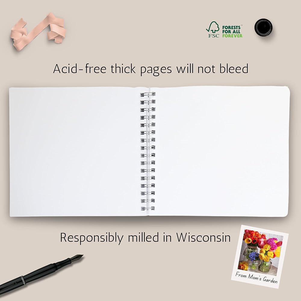 8.5" x 8.5" book, 90 blank pages (45 sheets), acid-free 14 pt paper milled responsibly in Wisconsin, FSC Certified. Made in USA.
