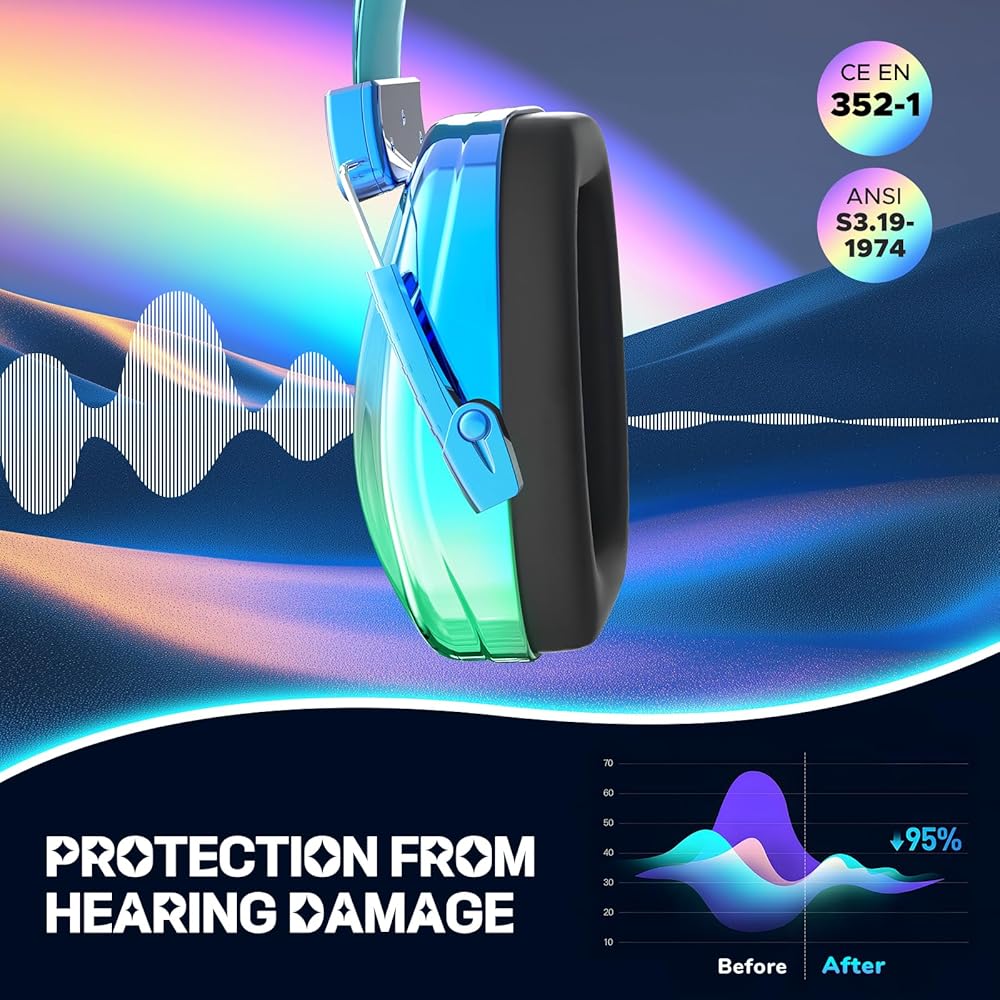 Secure and Stylish Fit: The stretchable design of safety earmuffs ensures a secure and comfortable fit for kids aged 3 to 16 years old. these noise canceling headphones for kids feature a cool punk-inspired design with gradient colors that kids and teens will love it.Protect your little one's sensitive ears while making a stylish personality with our sound proof earmuffs - a must-have for any parent concerned about their child's hearing.