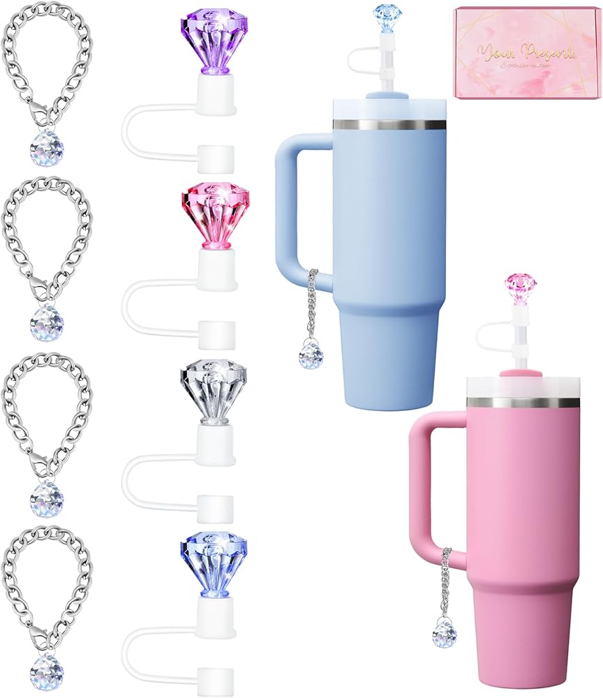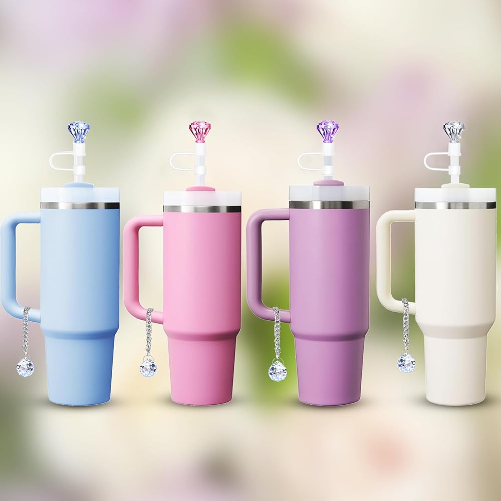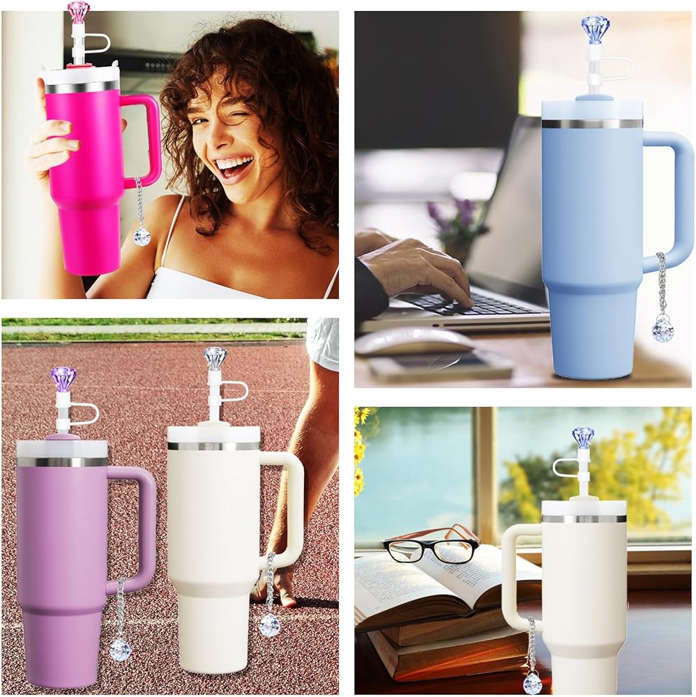 • STANLEY CUP ACCESSORIES SET:You will get 4pcs diamond straw topper, and 4pcs glitter crystal hand charms for stanley cup,you can change the water bottle accessories set as much as you want and easily share the tumbler cup charm straw cover with others!Due to the cute bling style,it is a unique funny gift for women girls. White pink blue purple straw cover cap for stanley cup 30 oz 40 oz.Reusable silicone straw tip.