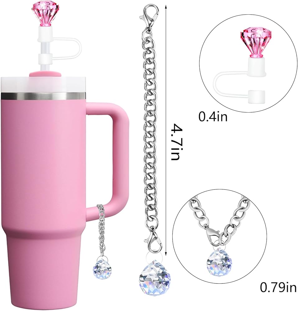 • CRYSTAL STANLEY CUP CHARMS FOR HANDLE:The stanley cup charms include 4pcs silver double lobster chain and 4pcs diamond charms .And these portable rainbow maker ball are ideal for men women who love sun catcher hanging crystals glitter bling bling lovers, items things,cool stuff must haves Stylish and practical water bottle accessories set for mom jewelry accessories for women.