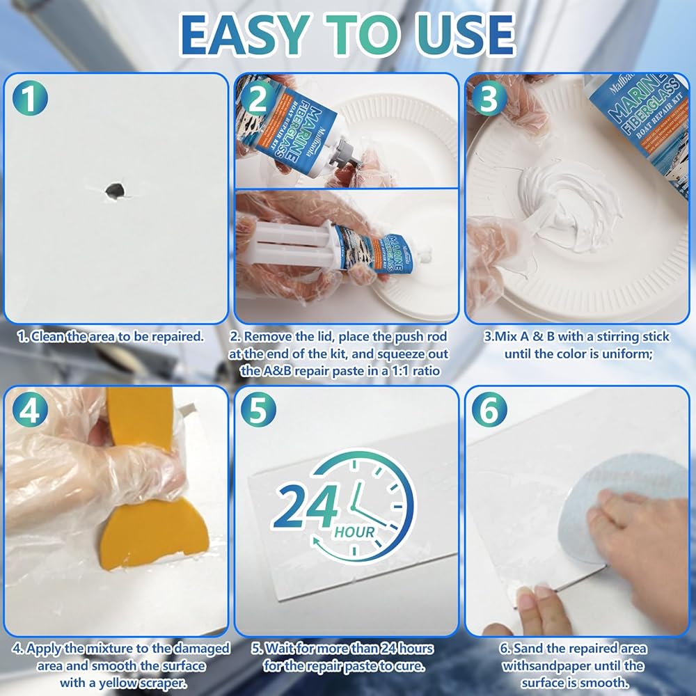 سهل الاستخدام: 1. نظف المنطقة المراد إصلاحها. 2. قم بإزالة الغطاء، ضع قضيب الدفع في نهاية طقم إصلاح الألياف الزجاجية للقارب، واضغط على طلاء القارب A & B بنسبة 1:1 3. امزج A & B بعصا التحريك حتى يصبح اللون موحدًا. 4. ضع الطلاء البحري على المنطقة المتضررة وقم بتنعيم السطح باستخدام مكشطة صفراء. 5. انتظر أكثر من 24 ساعة حتى يتم علاج معجون الإصلاح. 6. قم بصنفرة المنطقة التي تم إصلاحها باستخدام ورق الصنفرة حتى يصبح السطح أملسًا