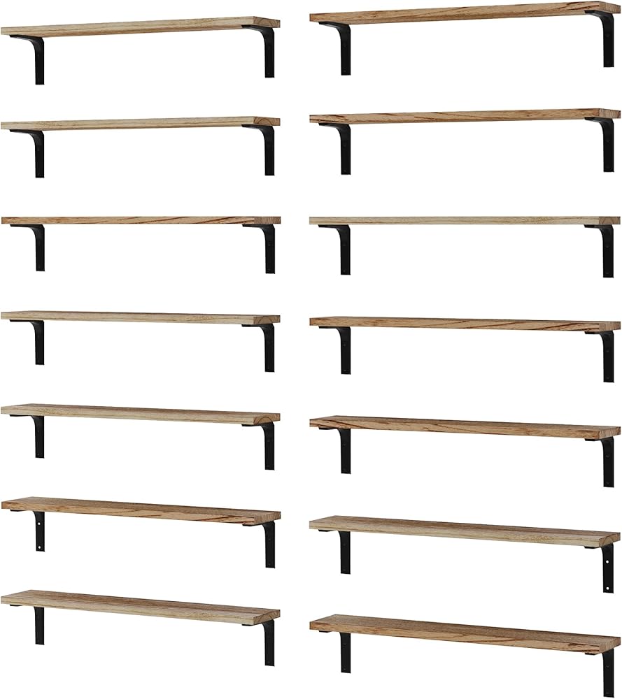 أرفف عائمة ريفية مقاس 24 بوصة من Wallniture Nola للجدار مع أقواس مقاس 4 بوصات، ورف كتب حائطي لغرفة المعيشة، ورف عائم لتخزين المطبخ، مجموعة من 14 قطعة (محروقة)