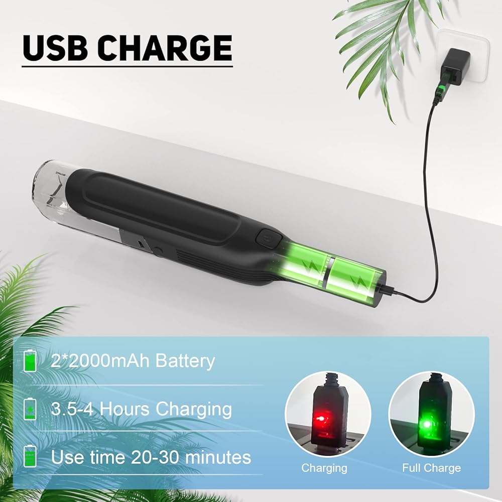 【قابلة لإعادة الشحن ولاسلكية】تأتي مع بطاريتين مدمجتين بقدرة 2000 مللي أمبير في الساعة*2، ستتيح لك المكنسة المحمولة اللاسلكية لدينا الحصول على مكنسة غبار أثناء التنقل! مع وقت تشغيل مدته 20 دقيقة، يمكنك الحصول على وقت تنظيف متواصل في أي وقت وفي أي مكان.