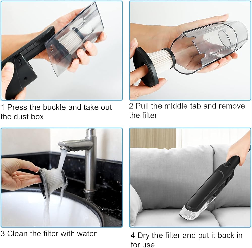 مرشحات قابلة للغسل وفوهات طويلة: تتميز المكنسة الكهربائية للسيارة اللاسلكية بفلتر HEPA 2.0، وفوهة طويلة قابلة للفصل، وفرشاة تلتقط حتى أصغر الجزيئات لتنظيف فعال وخالي من البقع. توفر هذه المكنسة الكهربائية الصغيرة سهولة الغسيل والتجفيف لإعادة الاستخدام.