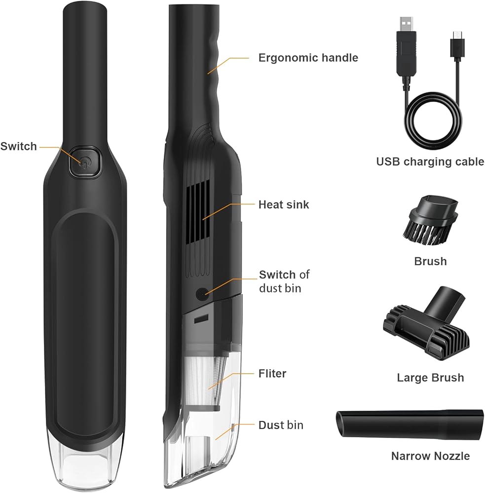 [مكنسة كهربائية متعددة الوظائف] تم تصميم المكنسة الكهربائية الصغيرة لتنظيف المنزل والمكتب وفي السيارة. يمكن للمكنسة الكهربائية اللاسلكية تفريغ الغبار ونفخ الغبار. إنه مساعد جيد لتنظيف الغبار للوحة المفاتيح الخاصة بك لجهاز الكمبيوتر أو أجهزة الكمبيوتر المحمولة. يمكن استخدامها كمكنسة كهربائية ومنفضة هواء لتنظيف الفجوات في النوافذ/الأبواب/الكمبيوتر الشخصي/مكيف الهواء، إلخ.