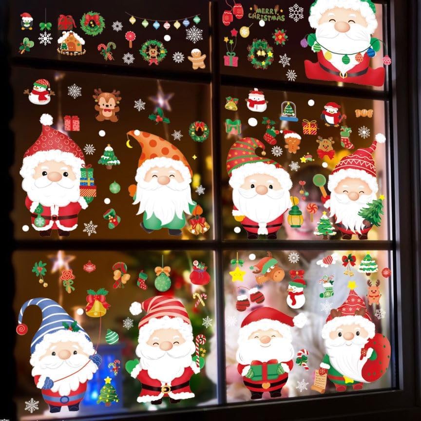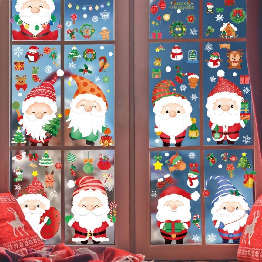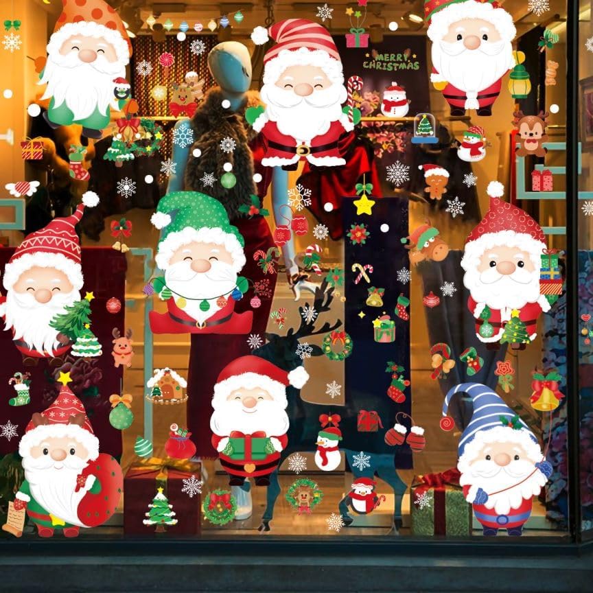 150 قطعة من ملصقات نوافذ عيد الميلاد، 9 ورقات قابلة لإعادة الاستخدام على الوجهين سانتا كلوز لعيد الميلاد من زجاج النوافذ الكهروستاتيكية للزجاج، ملصقات زينة نوافذ عيد الميلاد لمركز تسوق الحفلات