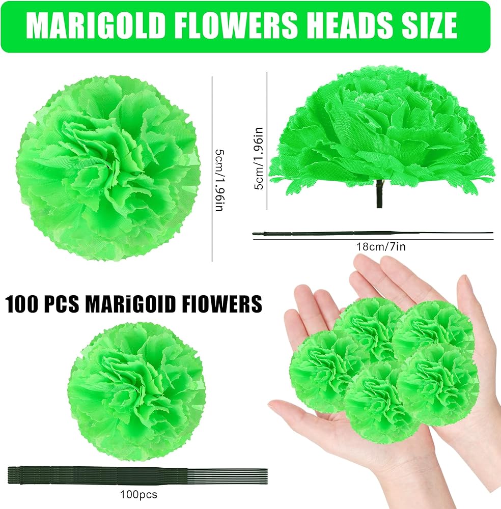100 pcs orange artificial marigold flowers heads and 100 pcs sticks.They are made of bright orange silk wich feels fluffy like actual marigold flower.