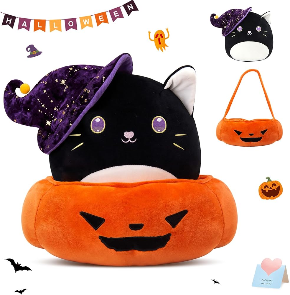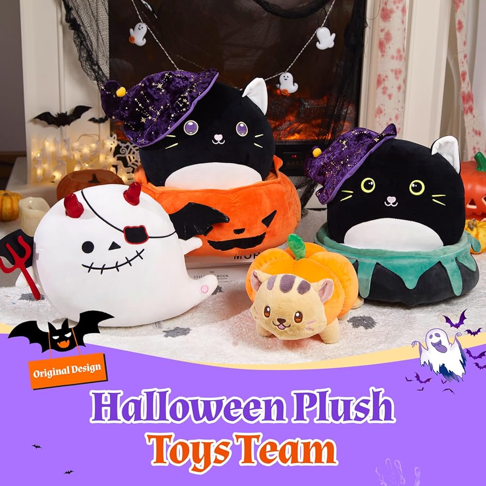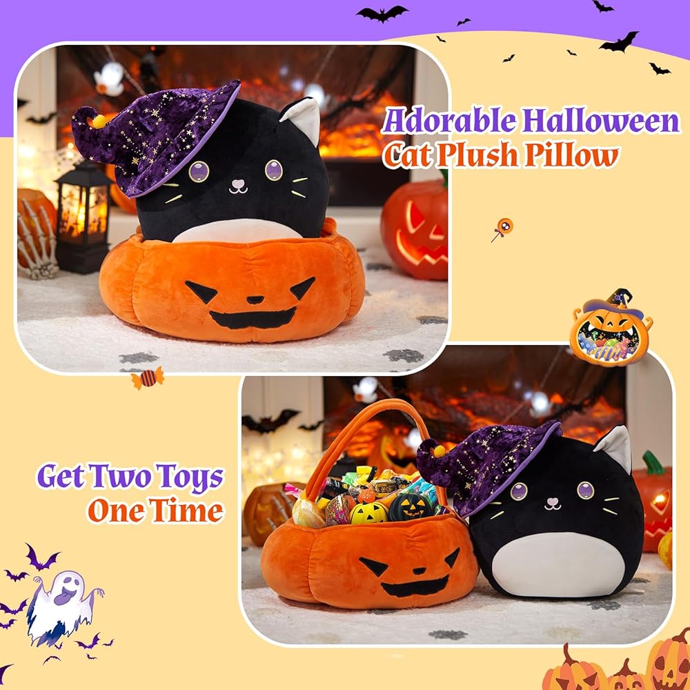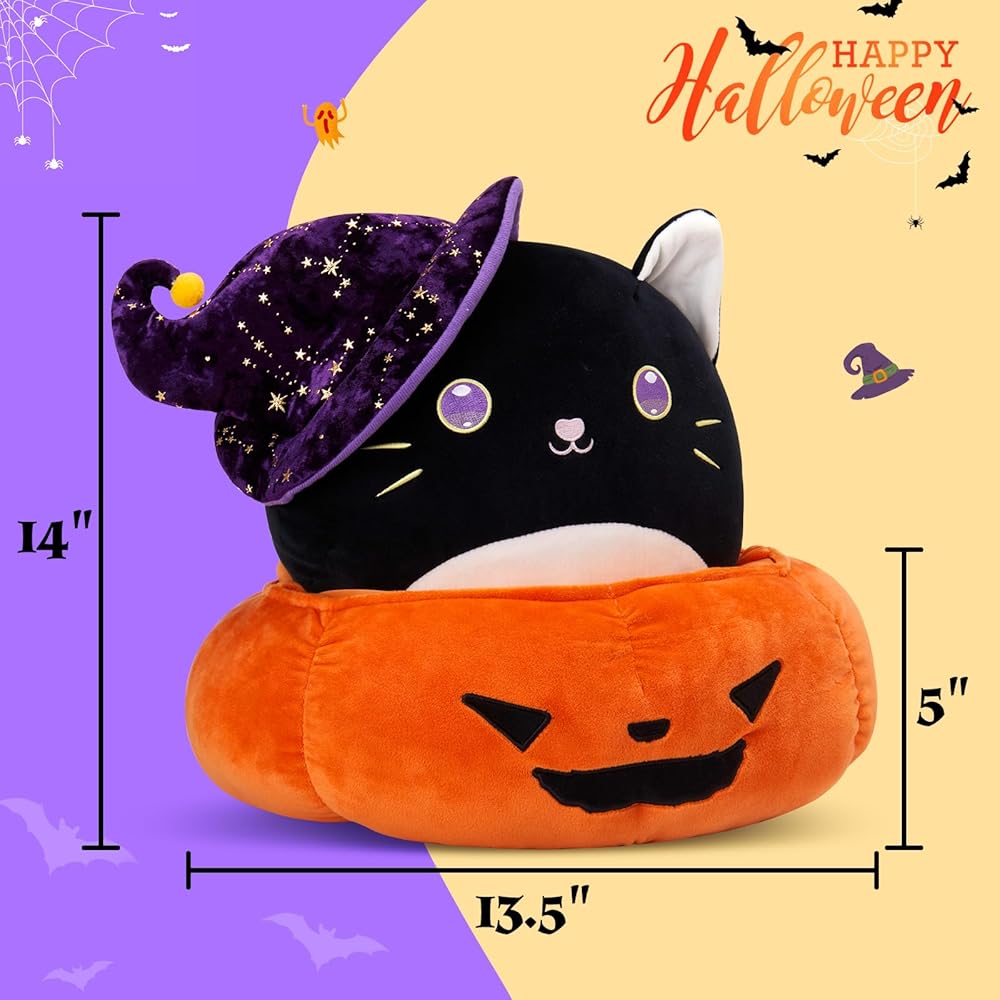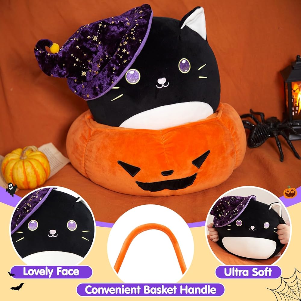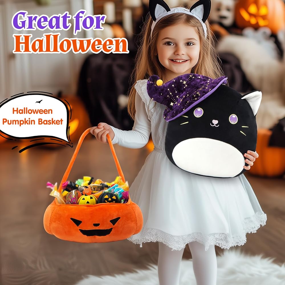 الحجم المثالي: يبلغ طول المجموعة حوالي 14 بوصة. يبلغ طول لعبة القطة القطيفة 30.48 سم، وهي الحجم المثالي للعناق أو العرض على السرير أو الأريكة، أو إضافتها إلى ديكورات حفلات الهالوين الخاصة بك. يبلغ حجم سلة اليقطين 13.5 بوصة وطولها 5 بوصات، وينبغي أن تكون سلة خدعة أو حلوى لطيفة.