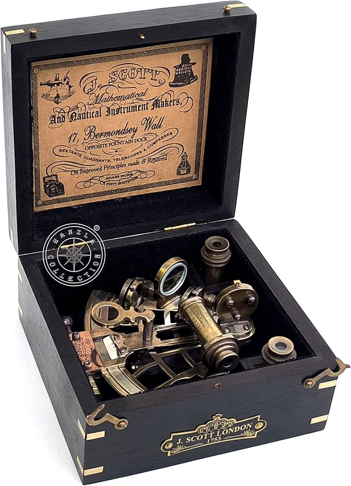 ABOUT : This sextant can be used to measure the angle between any two visible objects. It's primary use is to determine the angle between a celestial object and the horizon which is known as the altitude. This doubly reflecting navigation instrument is made of pure brass with antique finish & comes in a protective wooden case.
