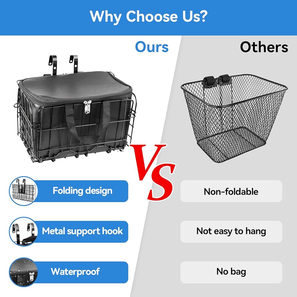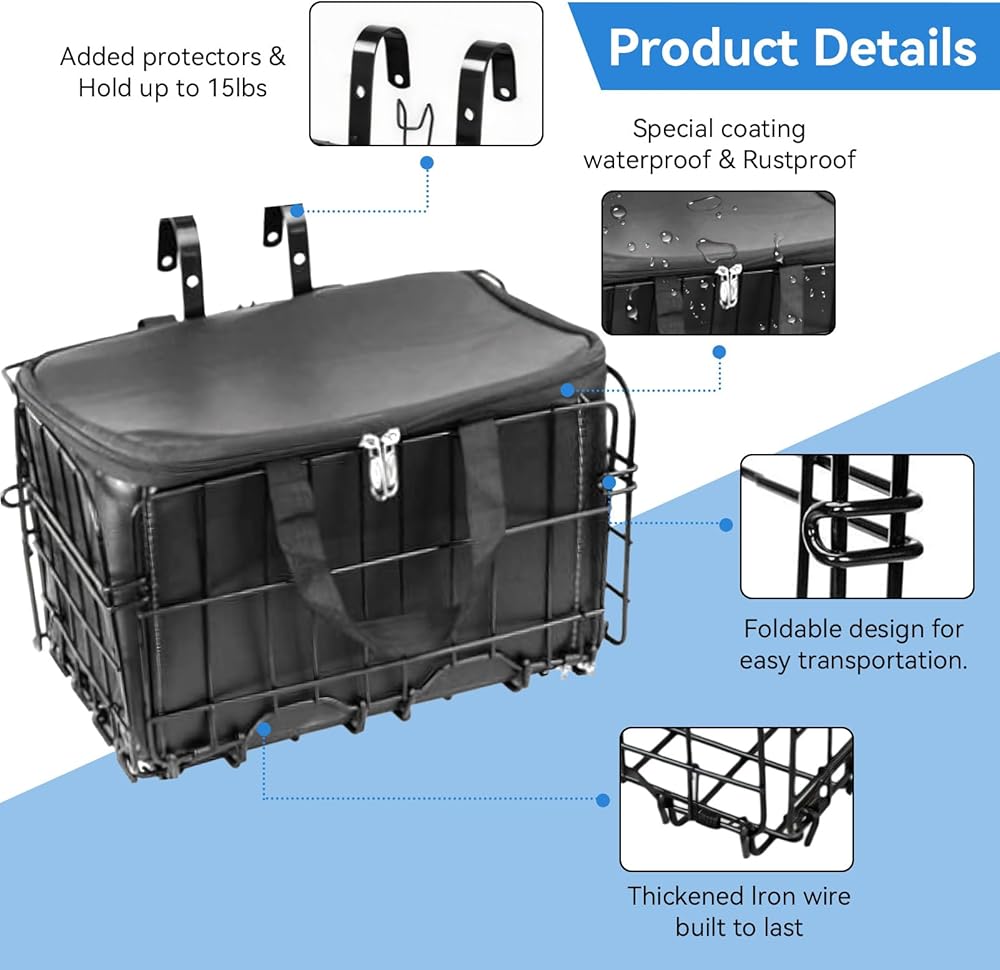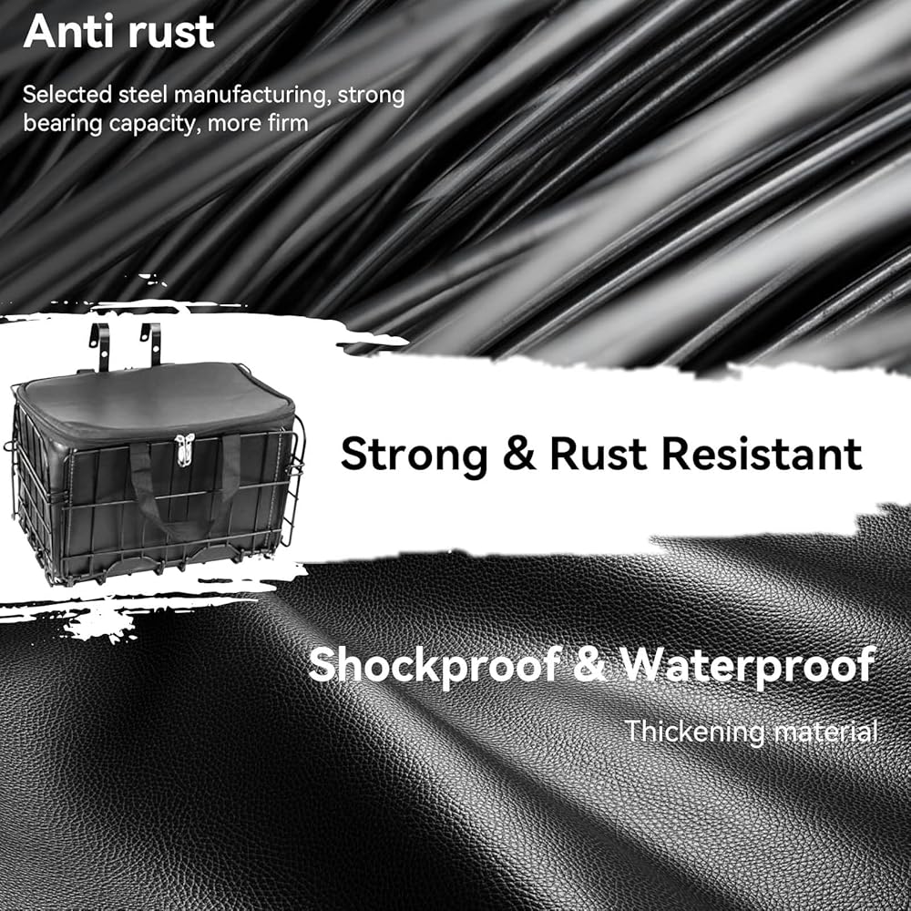 🚲 شديدة التحمل ومقاومة للطقس: سلة الدراجة مصنوعة من سلك حديد سميك، تدعم ما يصل إلى 15 رطلاً (7 كجم). يعزز طلاء المسحوق الأسود اللامع المظهر الجمالي ومقاومة الطقس، ويحمي من الصدأ والتآكل.