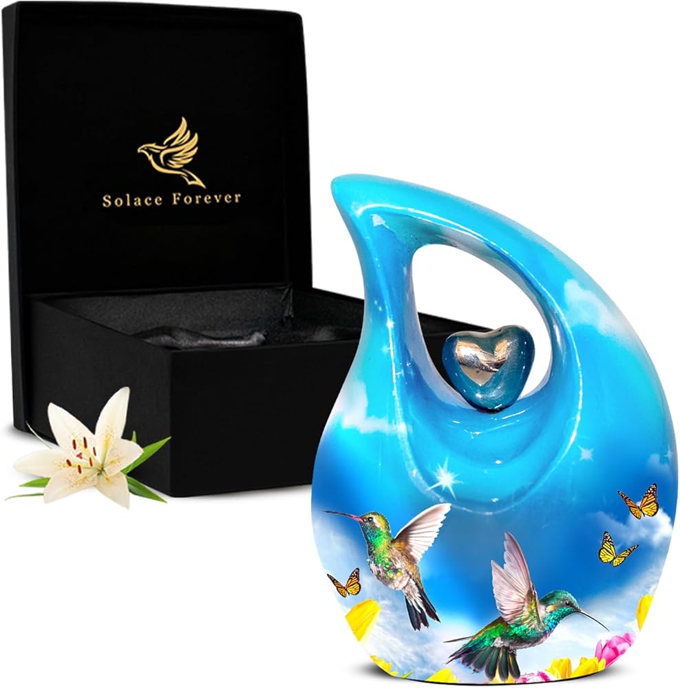 تشتمل على حقيبة مخملية: تأتي جرة حرق الجثث على شكل دمعة مع حقيبة مخملية عالية الجودة. هذه الحقيبة الجميلة آمنة لحمل وتخزين جرة الطائر الطنان على شكل دمعة.