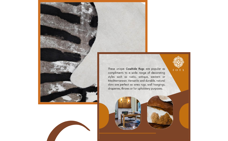 • كل إخفاء أصلي: تعرض كل سجادة من جلد البقر الأصلي أنماطًا وألوان طباعة طبيعية حقيقية فريدة من نوعها للحيوان الذي أتت منه. على الرغم من أن كل قطعة ستشبه الصورة، إلا أنها ستختلف قليلاً في اللون والنمط والأبعاد. وهذا يجعل كل سجادة تحفة فنية فريدة من نوعها لن يمتلكها أحد سواك.