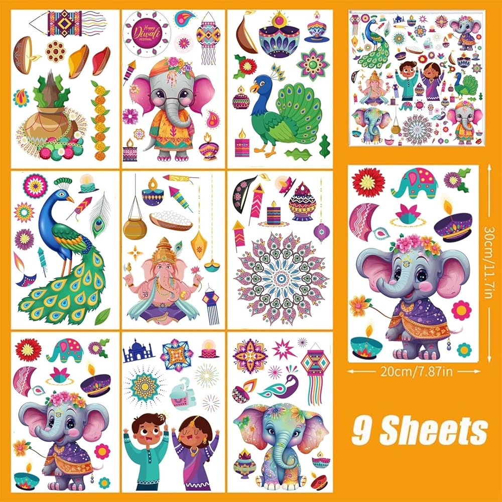 9 أوراق ملصقات نافذة ديوالي لنافذة الزجاج، ملصقات نافذة ديوالي، ملصقات مصباح الطاووس الهندي، زينة نافذة ديوالي، أضواء نافذة الحفلات، لوازم الشارات الثابتة