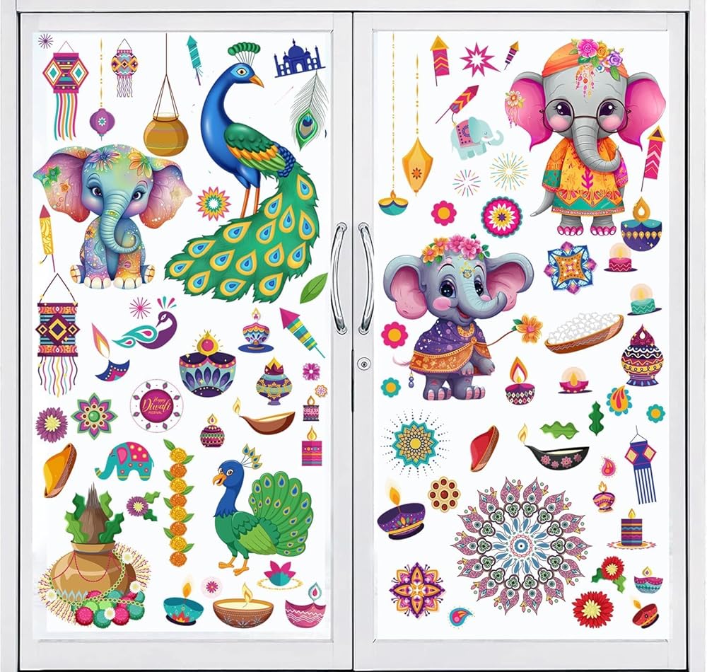 • Unique Design: The Diwali window decoration are designed with various vivid and bright patterns, including lamps, peacocks, elephants, etc. These window decals can bring a lot of warm and lively festival atmosphere to your window.
