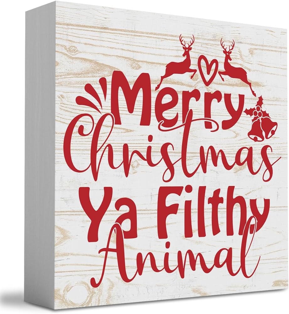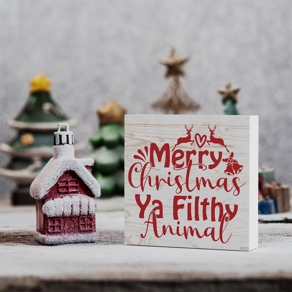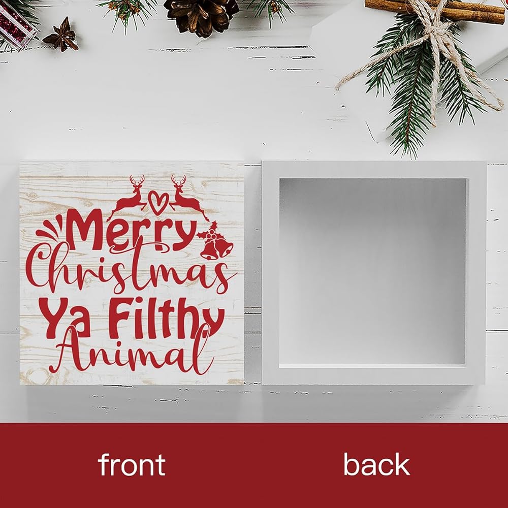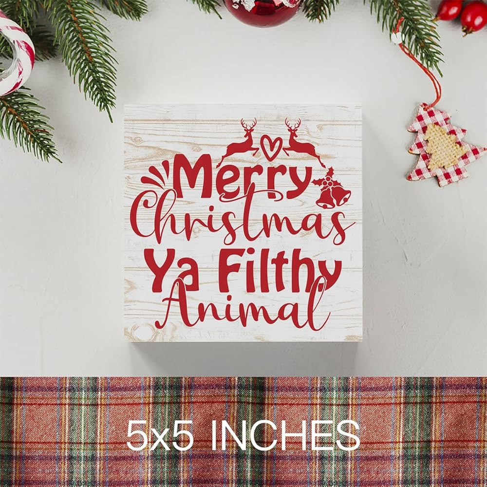 WRSUNT الرجعية عيد ميلاد سعيد يا القذرة الحيوان علامة صندوق خشبي، مزرعة عيد الميلاد سانتا ديكور العمل الفني، رف المنزل مكتب الديكور 5 × 5 بوصة