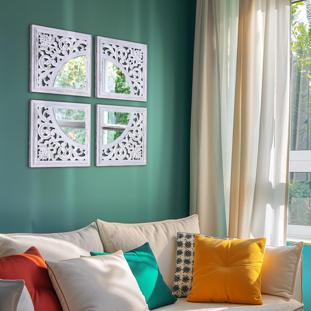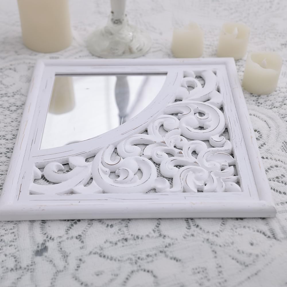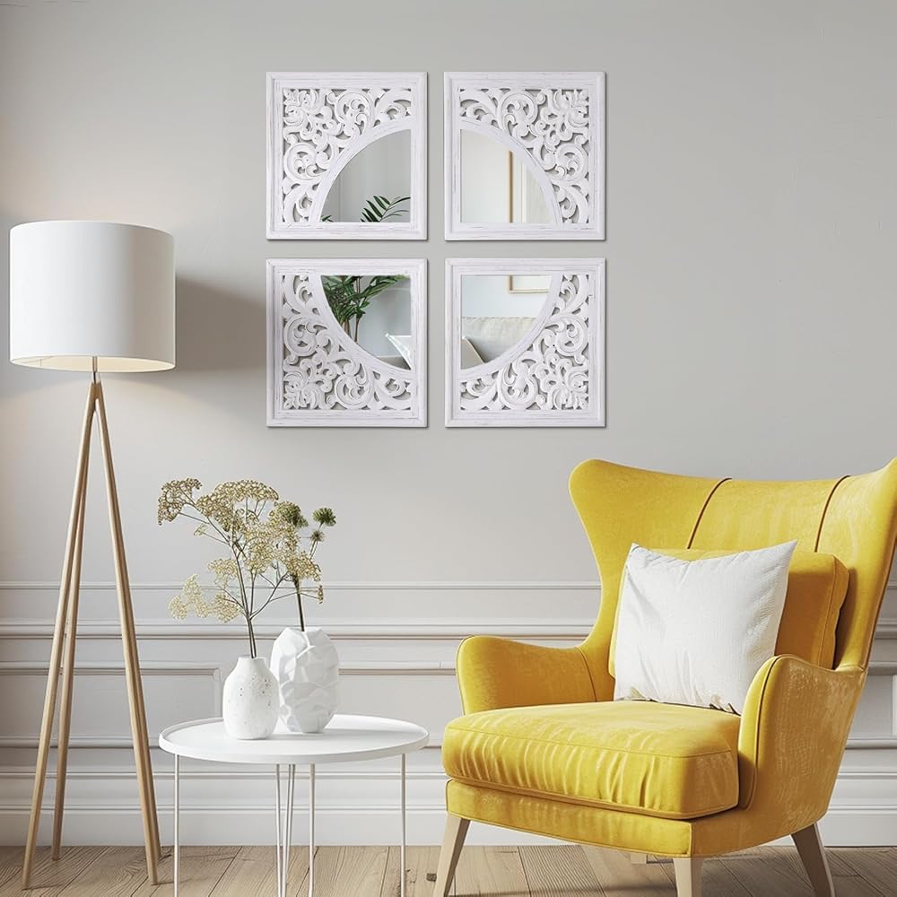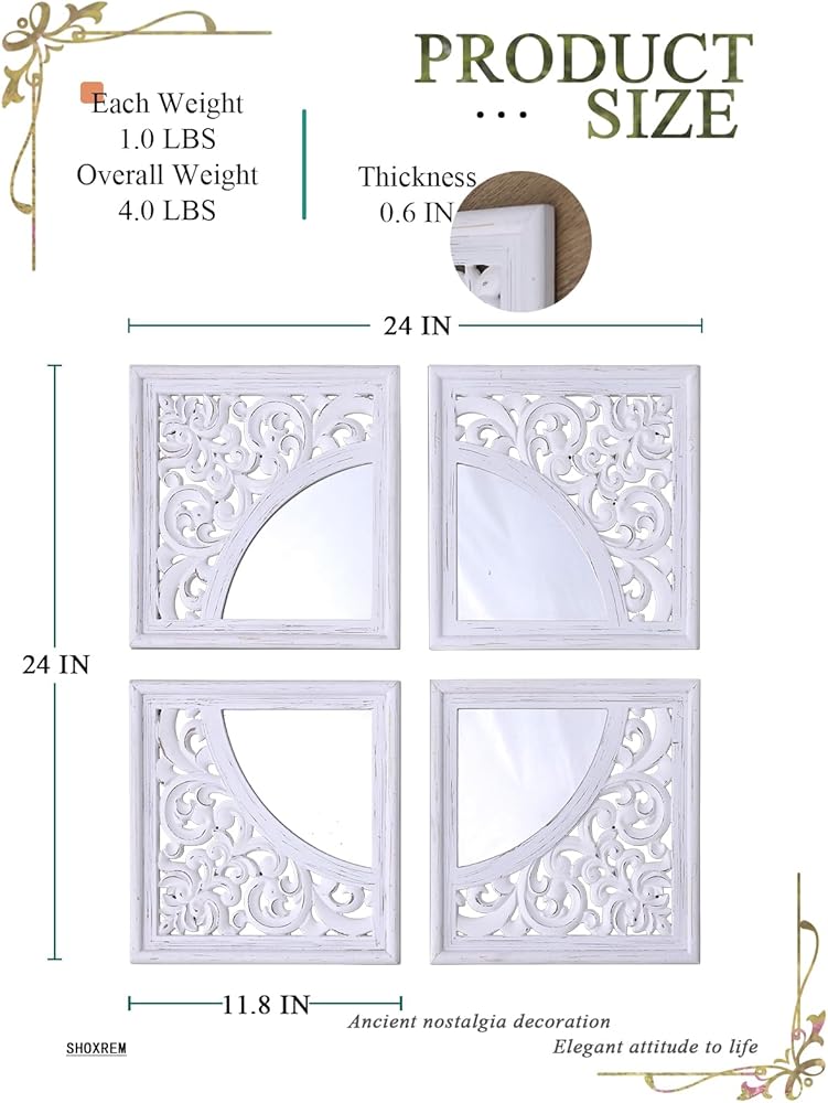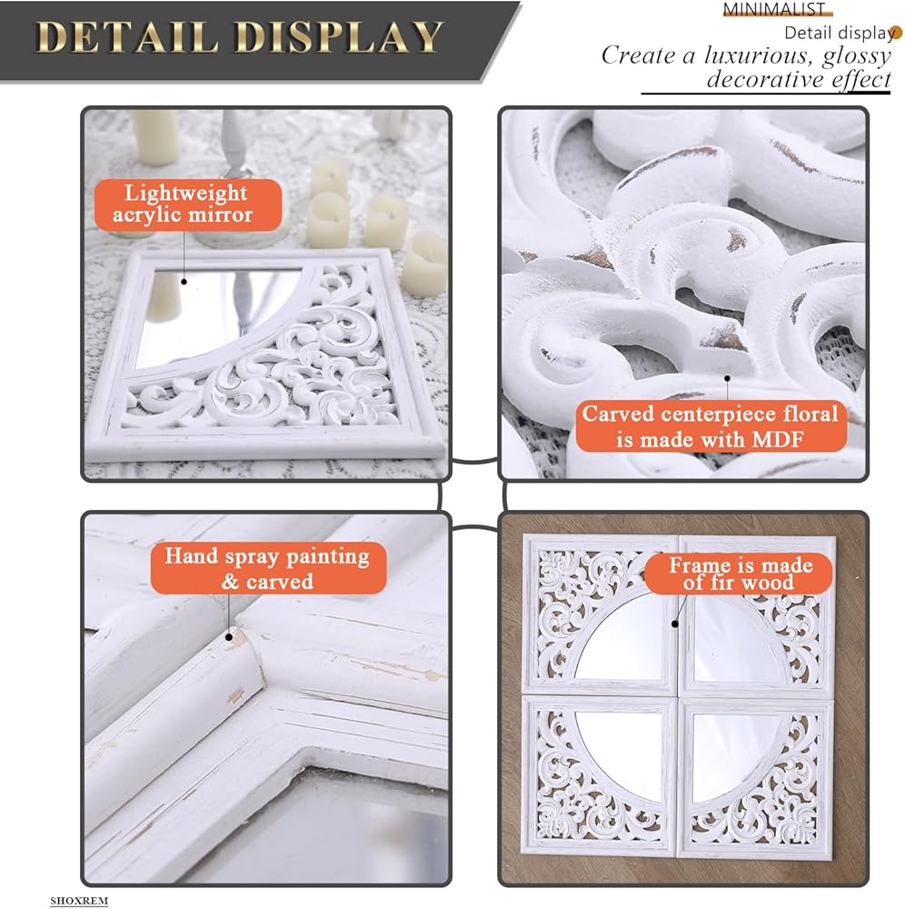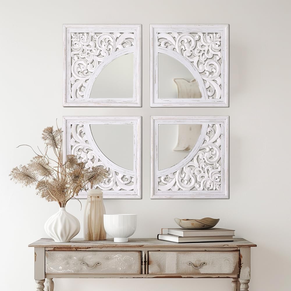 مجموعة ديكور حائط مربعة عتيقة من SHOXREM مكونة من 4 قطع، مرآة رائعة لمزرعة ريفية، مرآة دخول بيضاء منحوتة على الطراز الريفي لتجديد الحمام وغرف المعيشة. الحجم الكلي 24 بوصة عرض × 24 بوصة ارتفاع