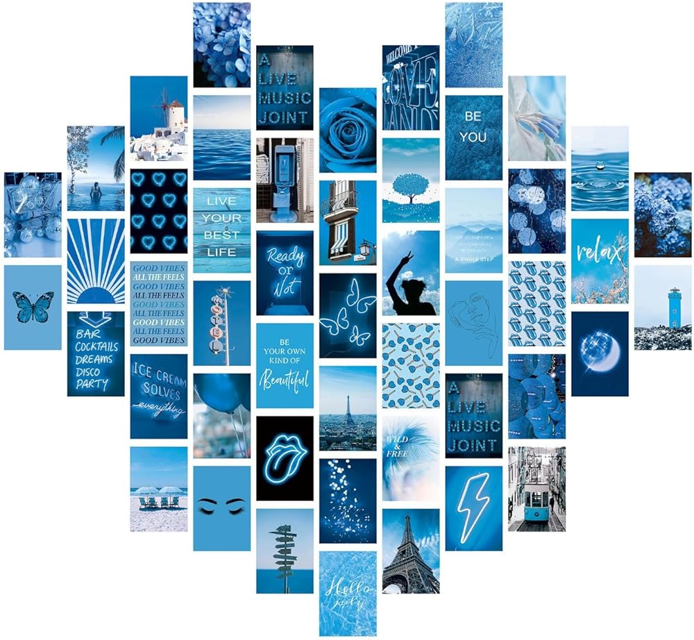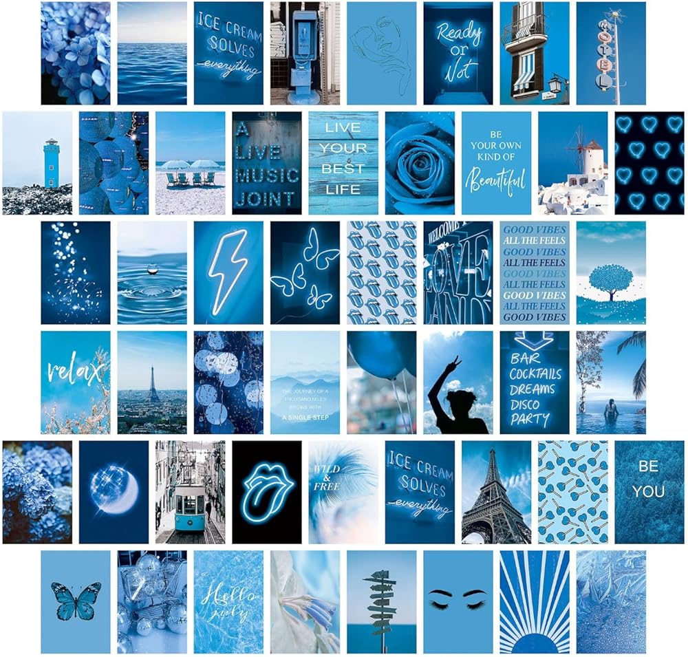 مجموعة ملصقات حائط زرقاء صور جمالية، ملصقات فنية جدارية لغرفة الفتيات المراهقات أو ديكور غرفة النوم، ملصقات صور بوهو، ديكور جداري جمالي، 50 مجموعة 4x6 بوصة (أزرق)
