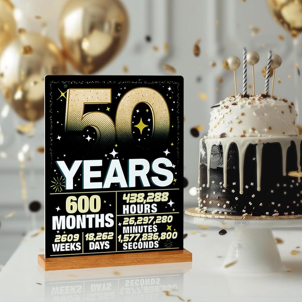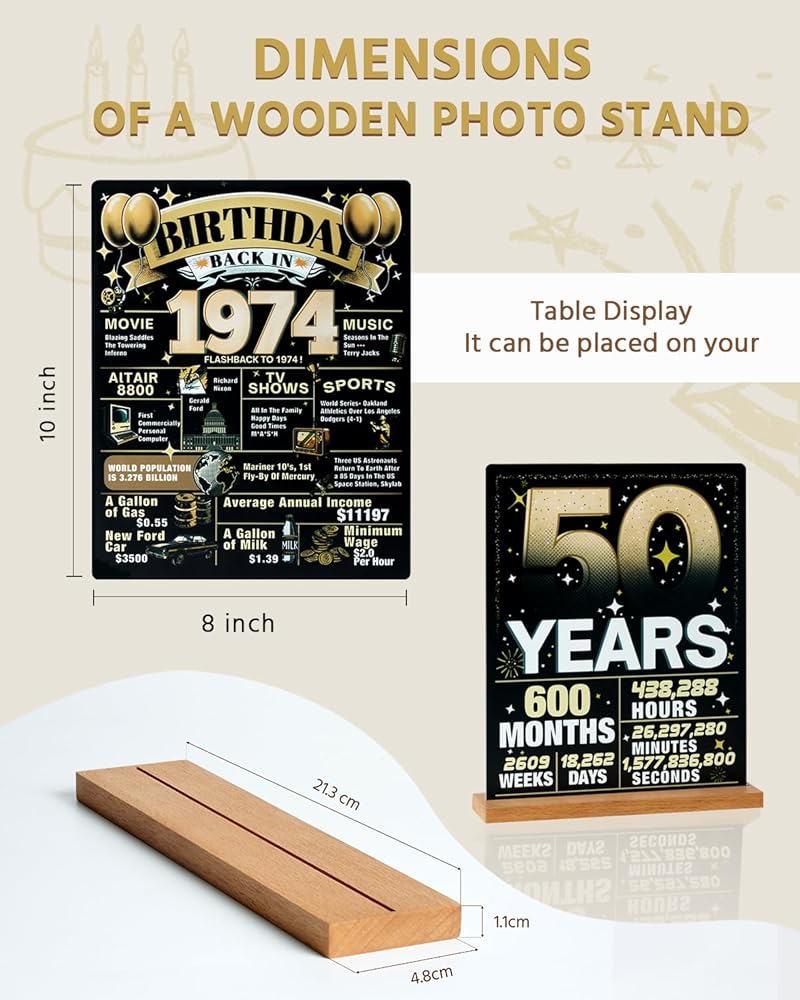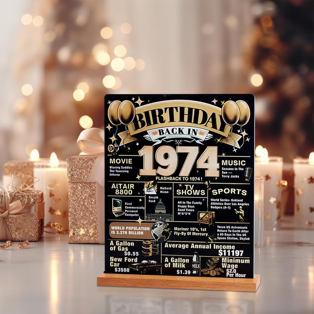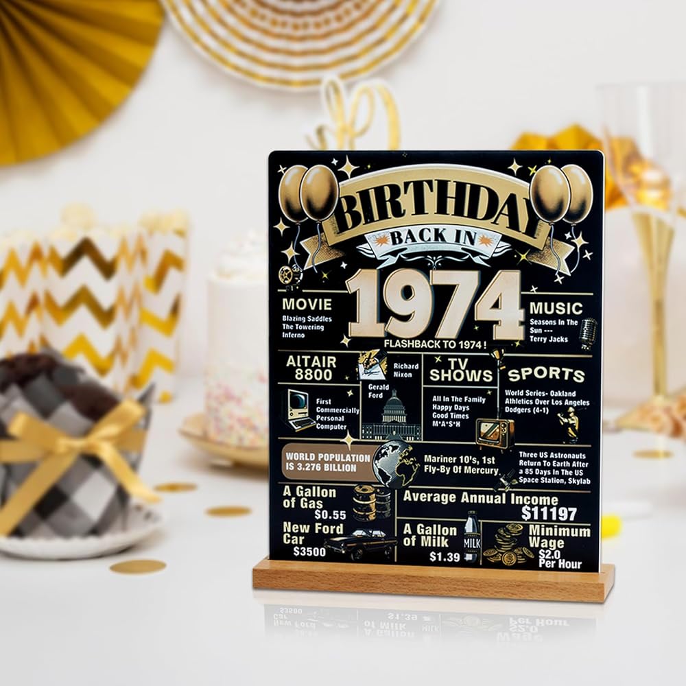 VIYYIEA زينة عيد الميلاد الخمسين للنساء والرجال، مرة أخرى في عام 1974، لافتة طاولة عيد ميلاد مع حامل، ملصق عيد ميلاد أكريليك مزدوج الطباعة باللون الأسود والذهبي، هدايا حفلات عيد ميلاد أنيقة للعائلة أو الأصدقاء، 8 × 10