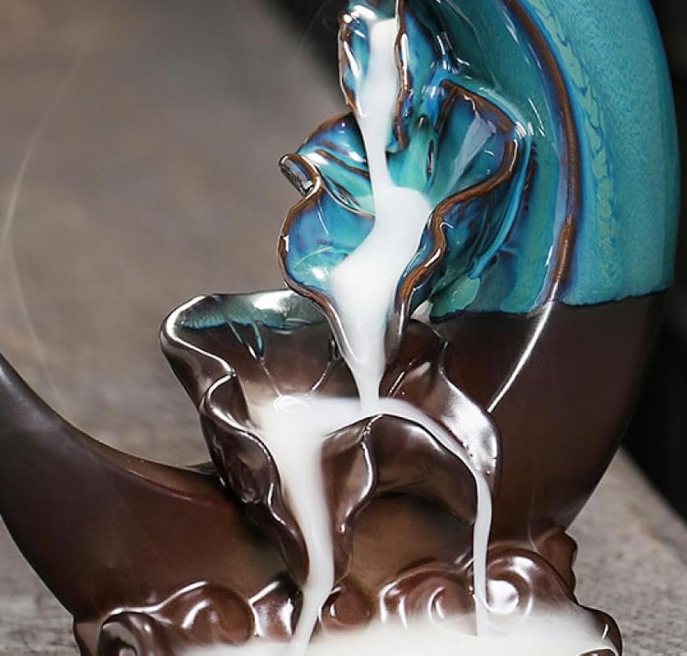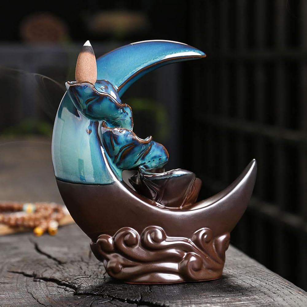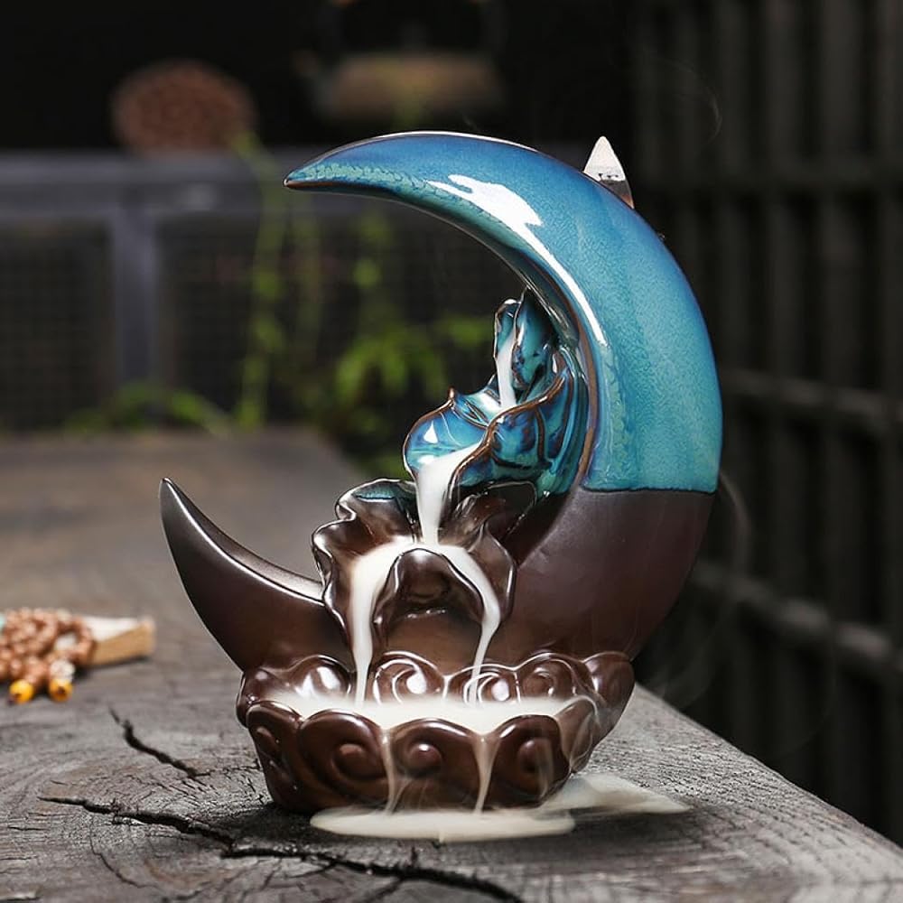 YYW مبخرة بخور على شكل قمر مبخرة شلال سيراميك Blakflow حامل بخور مع 20 مخروط بخور بتدفق خلفي + 30 عصا بخور، حصيرة، ملقط، زخرفة عطرية لديكور المنزل