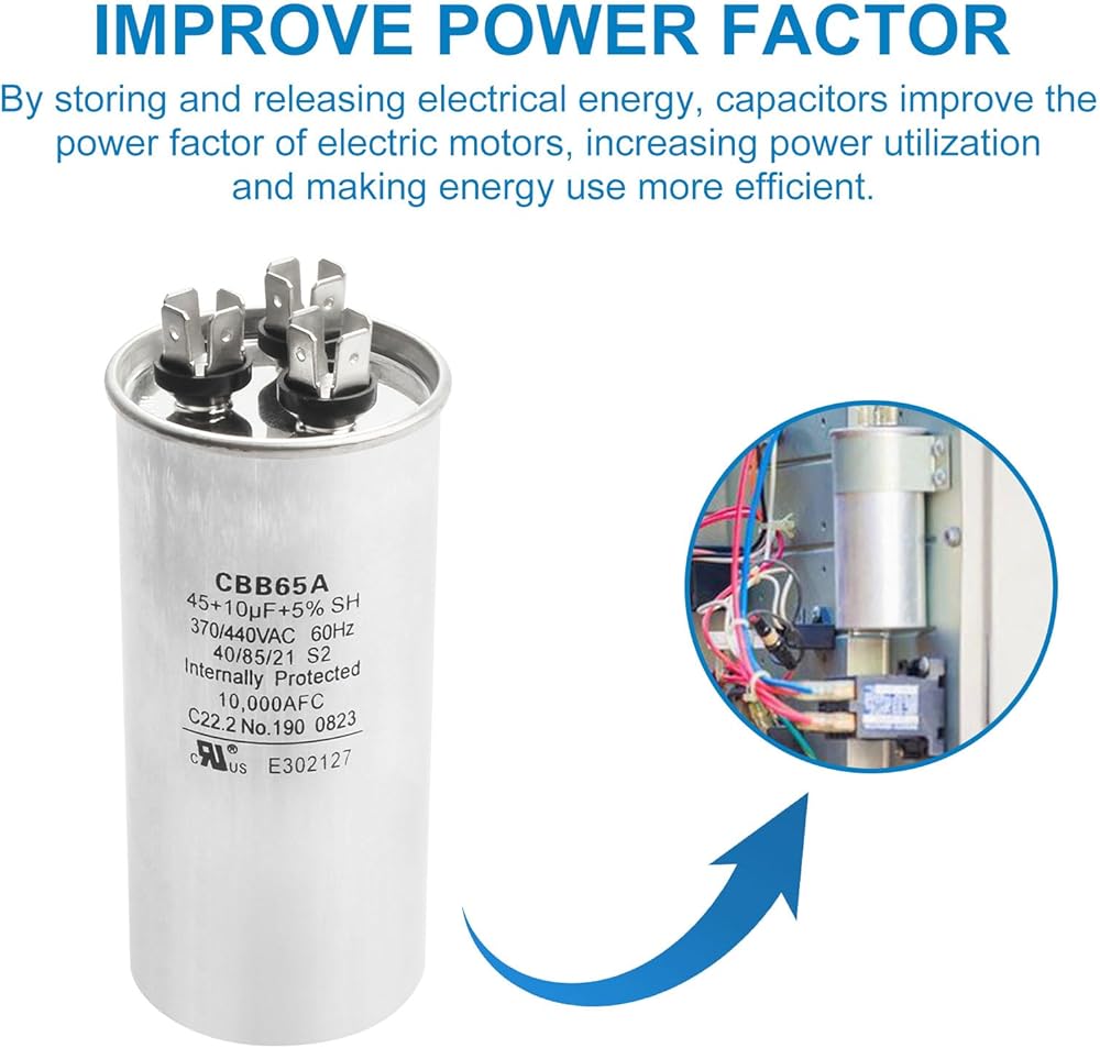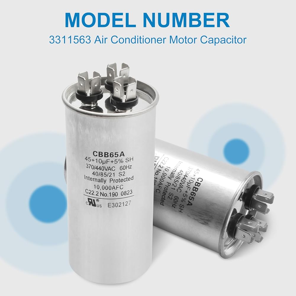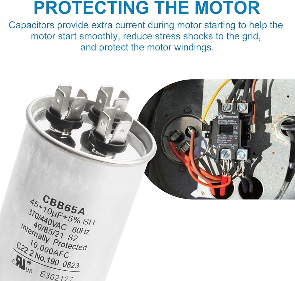 Featuring 45+10uf capacitance and a voltage rating of 370/440VAC 60Hz, this capacitor is engineered to deliver consistent power and efficiency.Ensures durability and longevity, so you can trust that this capacitor will last for years to come.