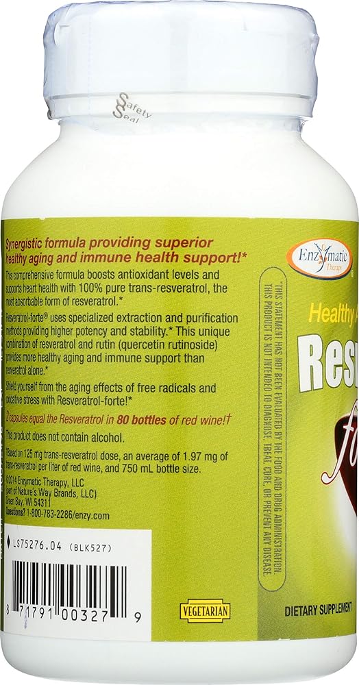Synergistic formula providing superior healthy aging and immune health support! This comprehensive formula boosts antioxidant levels and supports heart health with 100% pure trans-resveratrol, the most absorbable form of resveratrol. Resveratrol-forte uses specialized extraction and purification methods providing higher potency and stability. This unique combination of resveratrol and rutin (quercetin rutinoside) provides more healthy aging and immune support than resveratrol alone. Shield yourself from the aging effects of free radicals and oxidative stress with Resveratrol-forte! 2 capsules equal the Resveratrol in 80 bottles of red wine! Based on 125 mg trans-resveratrol dose, an average of 1.97 mg of trans-resveratrol per liter of red wine, and 750 ml bottle size. Suggested use Take 2 capsules daily.