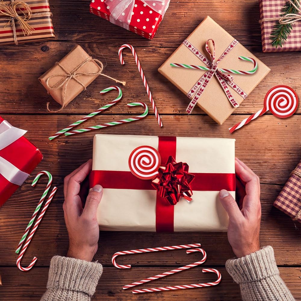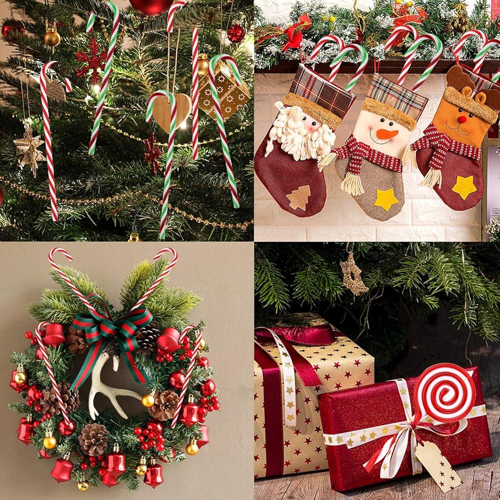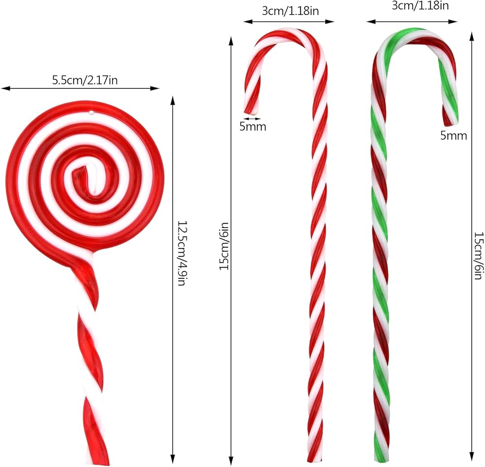 تصميم وحجم ملتوي: يبلغ طول عصا حلوى عيد الميلاد حوالي 15 سم / 5.9 بوصة، والعرض حوالي 3 سم / 1.2 بوصة، وطول المصاصة حوالي 12 سم / 4.7 بوصة. ألوان كلاسيكية لعيد الميلاد، تصميم خطوط منحنية لسهولة الإمساك والتعليق، تضيف جوًا جميلاً.