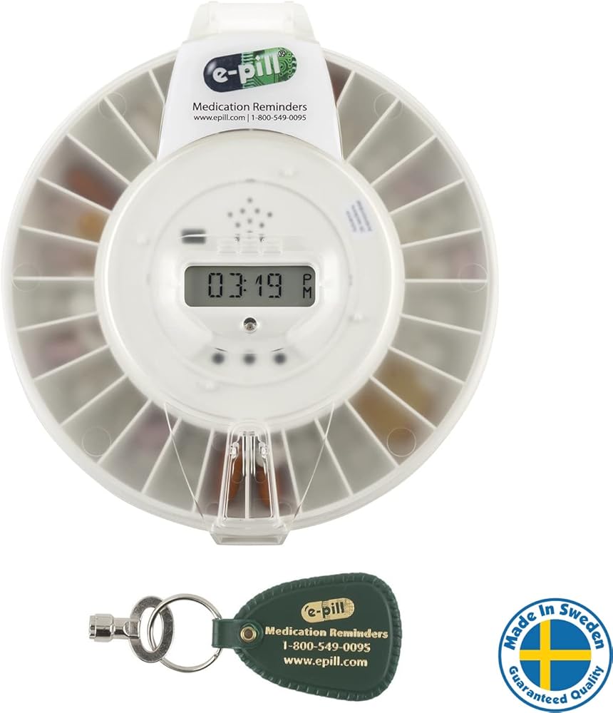 إدارة الدواء الكاملة: موزع حبوب آلي مغلق مع ميزات متقدمة وصينية دواء مكونة من 28 حجرة، وصينية دواء إضافية مكونة من 28 حجرة مع غطاء غبار للتعبئة عن بعد، وأدلة التعبئة ومفتاحين.